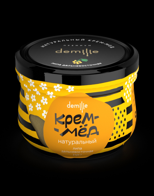 The jars are decorated with the signature black and yellow pattern. Flavored honey packaging is supplemented with vibrant abstract elements with an original color scheme created for each flavor. The lid has an illustration of the flavor or the honey plant from which the nectar for the dessert was obtained. Transparent windows on the packaging allow to see the product.