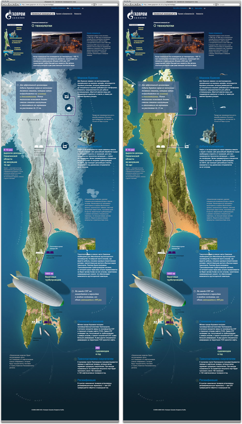 The site provides information on the project, its history and technologies. The major method is cooling the extracted gas to –160 °C and then shipping it by gas tankers as LNG (liquified natural gas). This is the first time this method is used in Russia. ![]() Production and Separation page features images of platform
