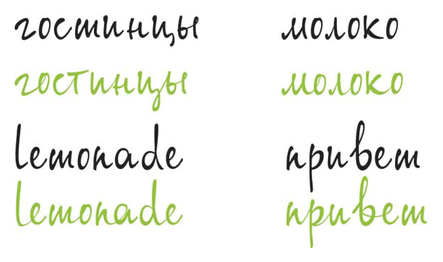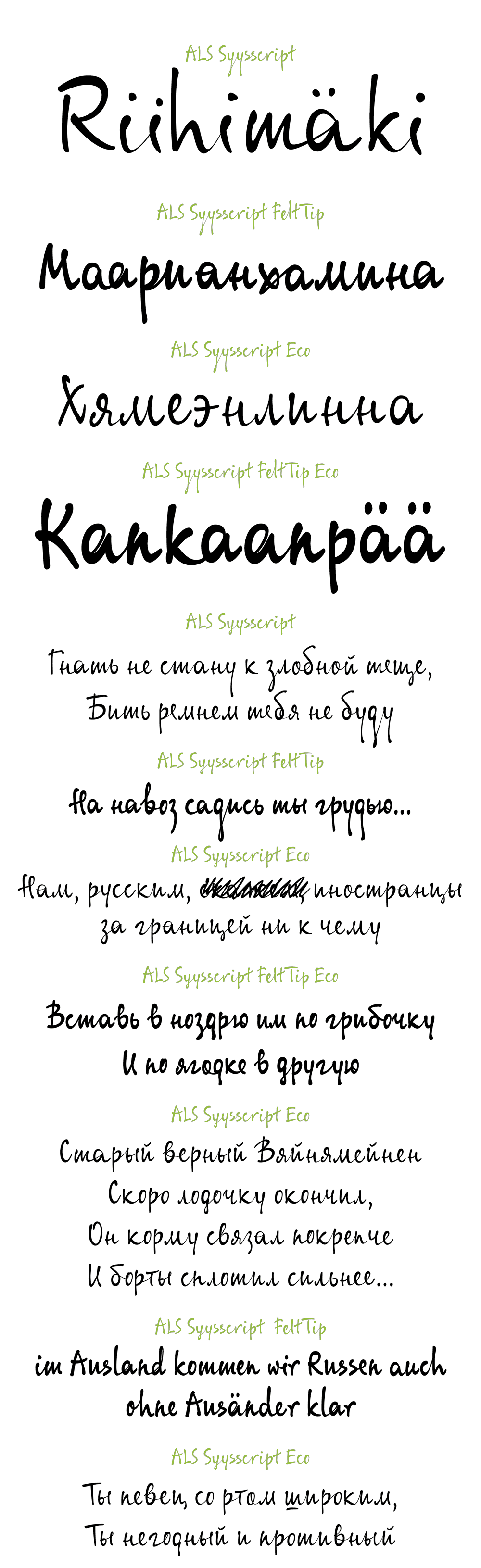 The type supports a great number of Latin and Cyrillic languages, its numerous ligatures take into account characteristics of both writing systems. Ligatures generally correspond with the most common two-letter syllables. At the same time, there remains a good number of unconnected letter combinations that keep Syys Script from being too repetitive. The extenders provide a sense of rapid rhythm with elements that sometimes encroach on to the next line, as is often the case in handwriting.