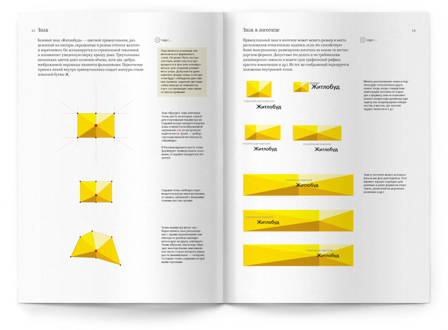 Zhytlobud logo has a lot to do with constructionit can be seen as a roof, a brick, or a fence sectionand comprises the letter form of Ж (the one the company name starts with). Besides the color version, there are black and white and outline logos.