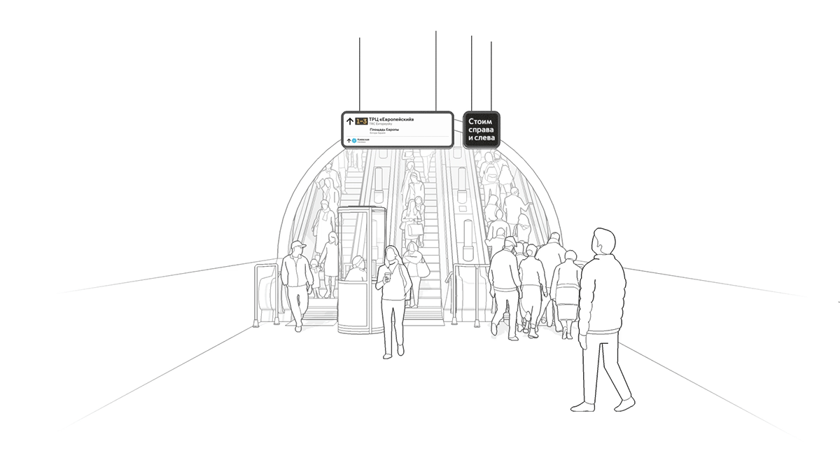 In Russian Metro, when going up on an escalator passengers tend to stand on the right side and leave an empty space on the left for passengers walking up. This habit is so strong that in peak hours the left side of the escalator can become completely empty. The traffic light developed at the studio indicates when to use the entire width of the steps.