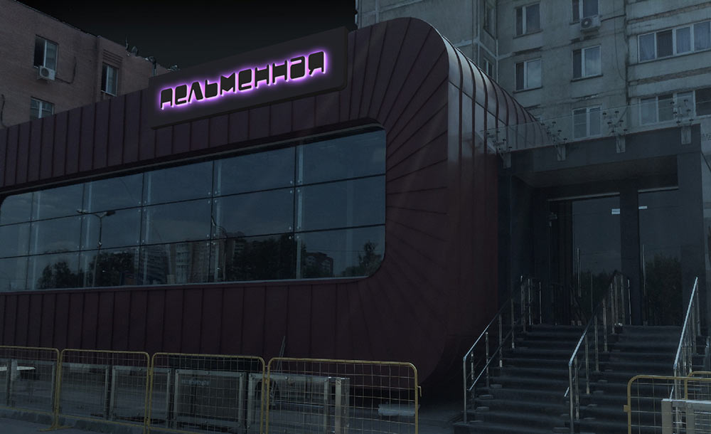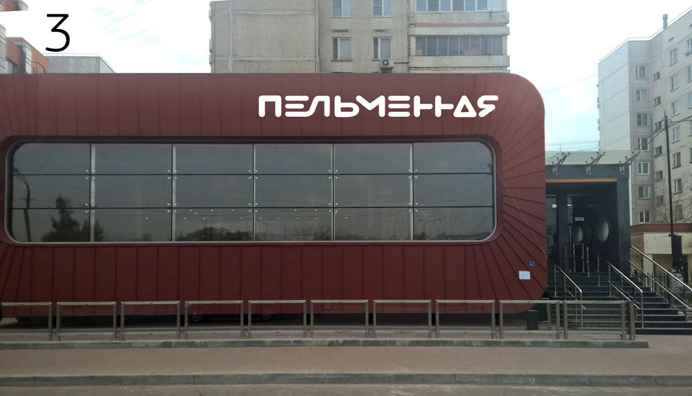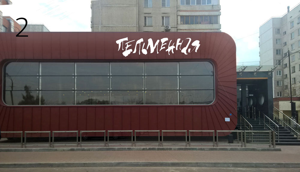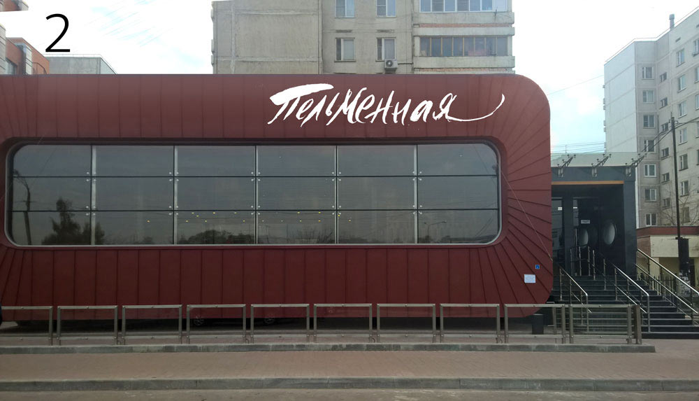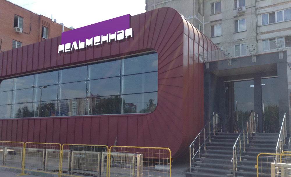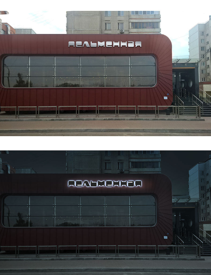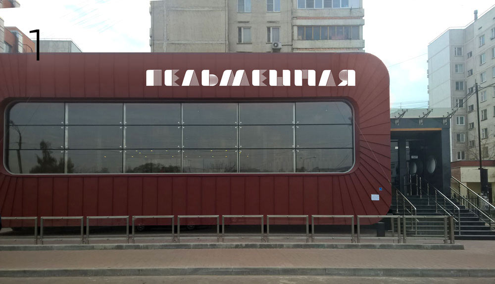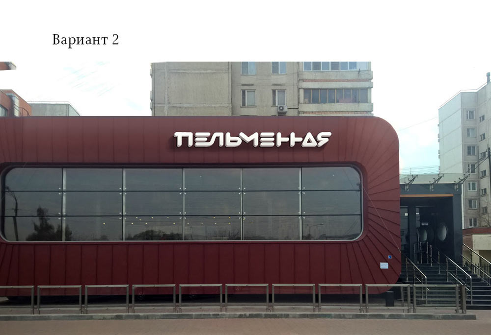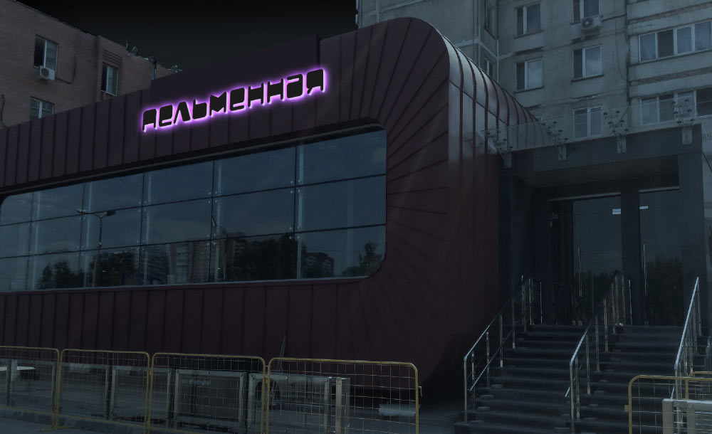 Receiving the task to create a sign for a pelmeni restaurant. Going to Zheleznodorozhny to get acquainted with the object. The building looks trendy and futuristic with a modern interior inside.