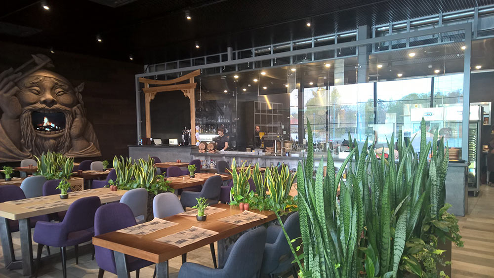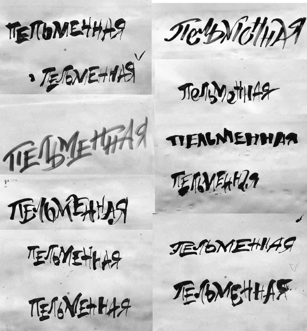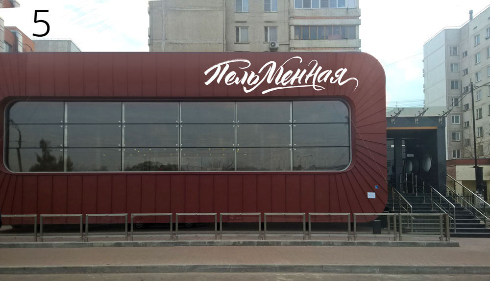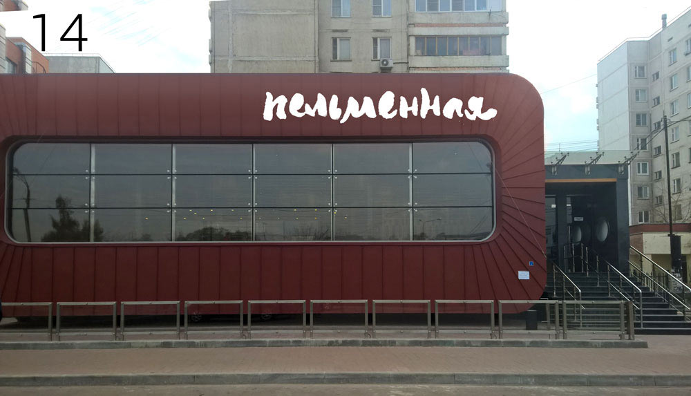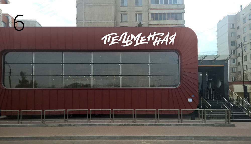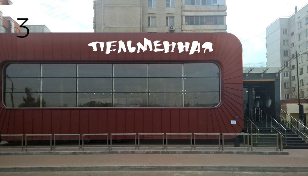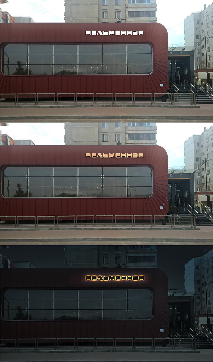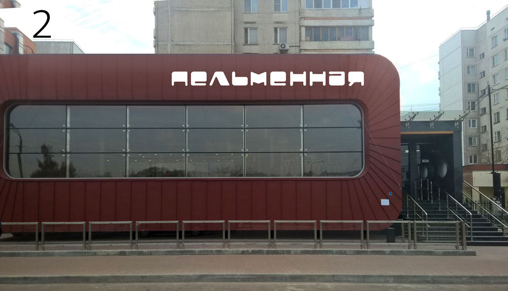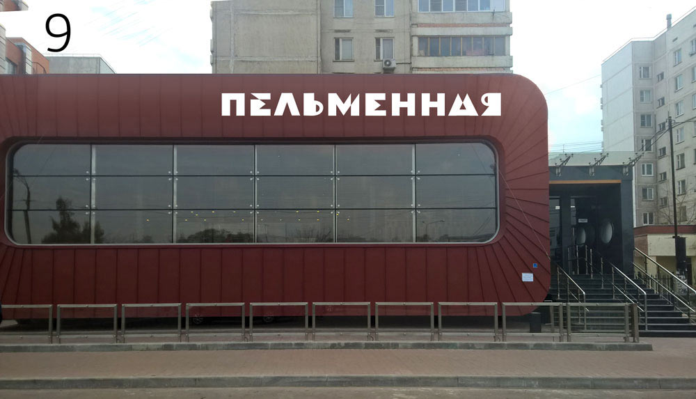 Receiving the task to create a sign for a pelmeni restaurant. Going to Zheleznodorozhny to get acquainted with the object. The building looks trendy and futuristic with a modern interior inside.