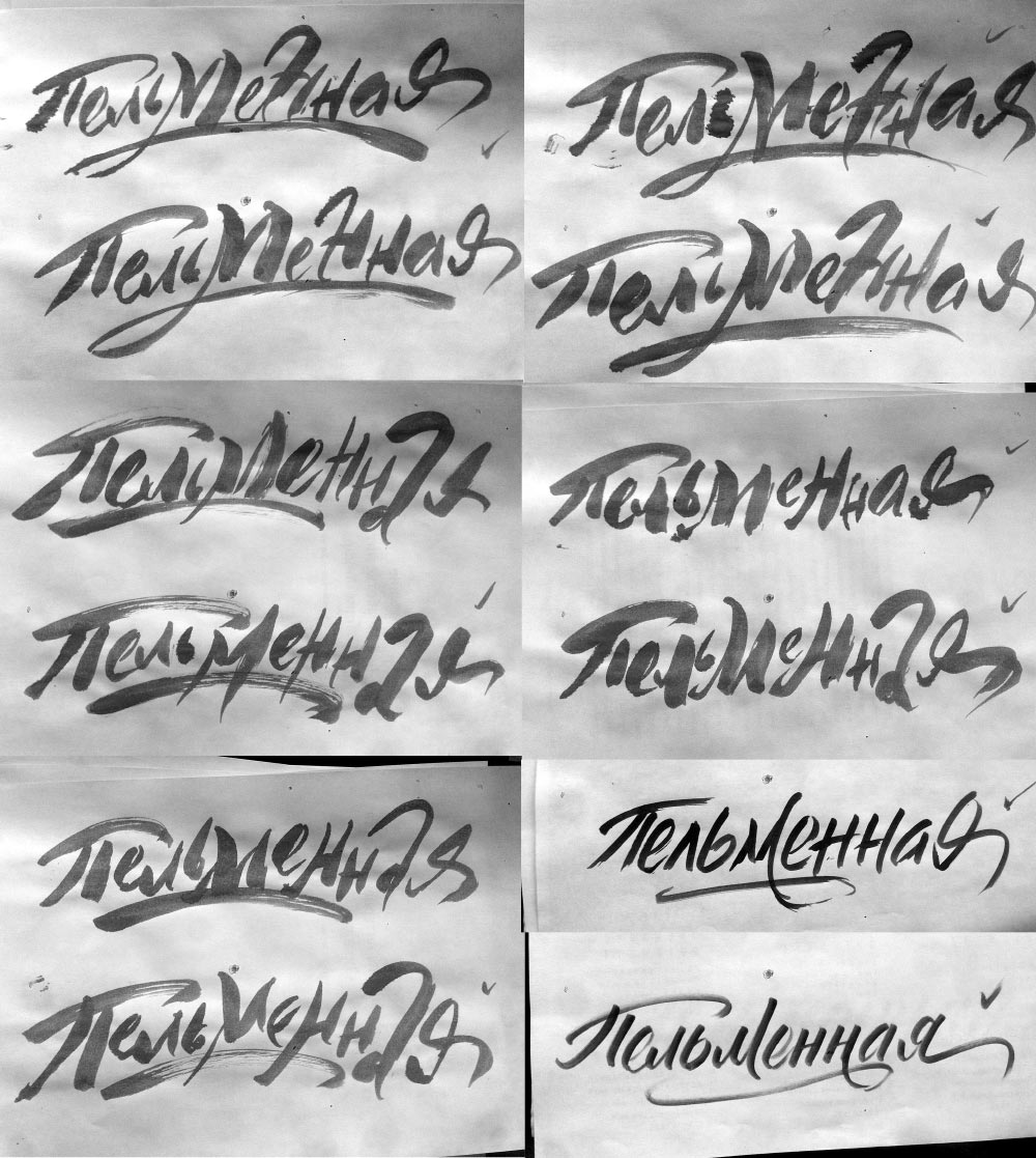 The sign should match the unusual façade. We have an idea to suggest a handwritten text, although not in a classic calligraphic tradition but in a more free and radical style. Taking the instruments and starting to write.