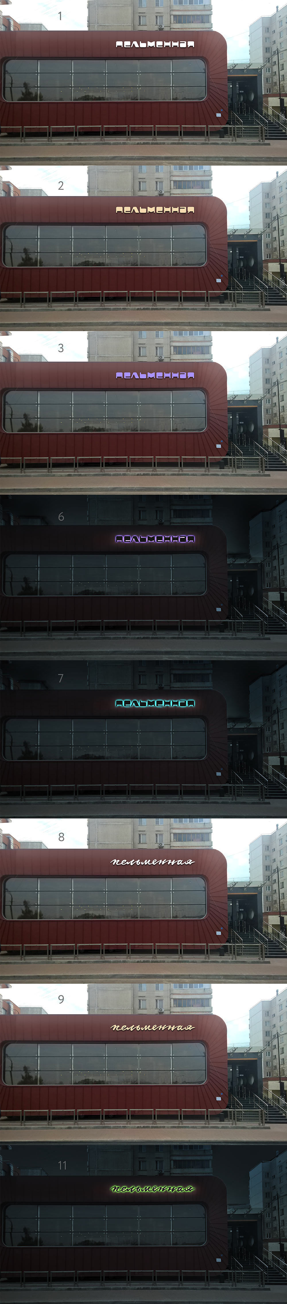 Designer: I suggest to implement it as flat letters with a metallic reflection and a night backlight. It would look more futuristic than volumetric lightboxes and will be cheaper to produce. Also, the first design (not the calligraphic one) will be easier to install.
