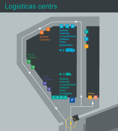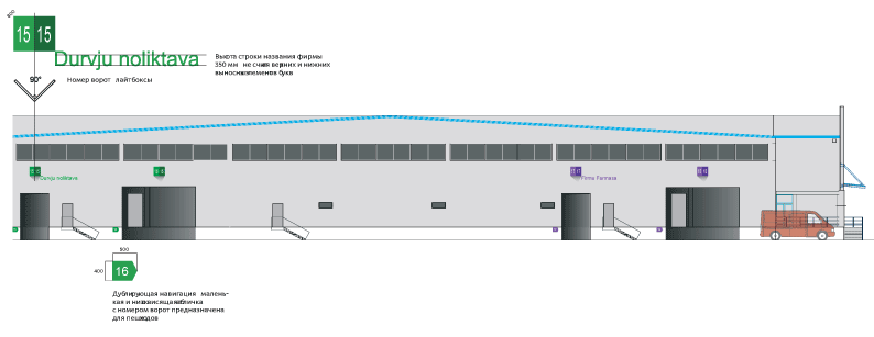 The center is constantly accepting trucks loaded with goods. The drivers are often puzzled looking for the necessary location. To make it easier for them all the entrances are numberednumber plates are of different colors, the large ones are put above and doubled by the smaller lower.