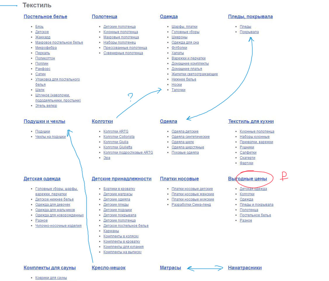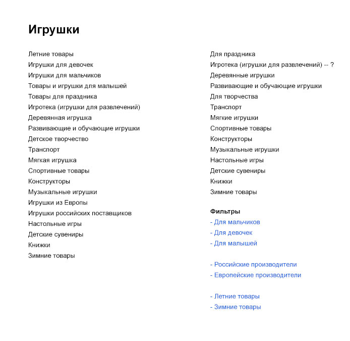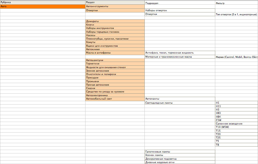 Exploring the current catalog structure, noting that many items are presented in several categories at the same time which confuses visitors and makes navigation difficult. Also, finding certain categories of products requires going 5–7 levels deep into the catalog. Removing the duplication and cutting the nesting levels down to three: category, section, subsection.
