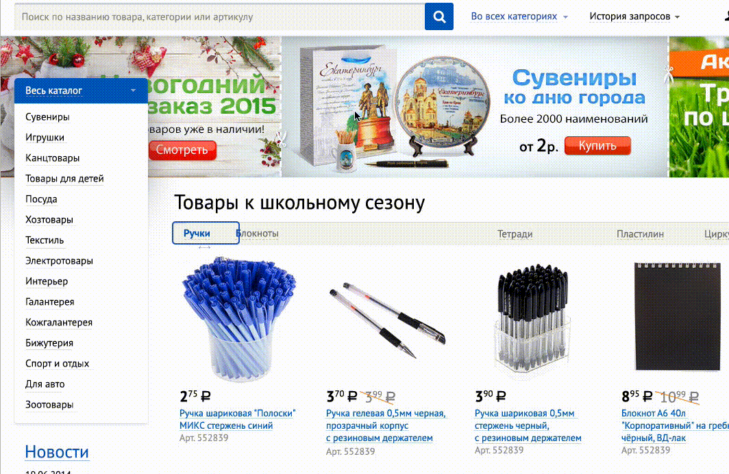 Using several attributes to create the catalog structure, such as item type (stationery, accessories, toys) and purpose (automotive products, sports and leisure, products for children). Removing duplication: pens, for example, belong to stationery, products for children and souvenirs. Physically they exist in a single place in the catalog, yet can be linked to from different categories.