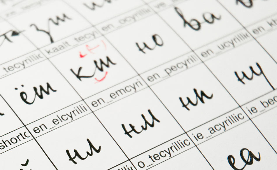 There were not enough samples of handwritten letters, so the bulk of work involved imagining and finalizing handwritten forms and connections.