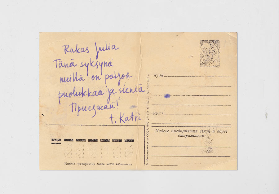 Autumn, asters, school, bright yellow sun in a clear sky, cold dew at sunset and a postcard with the text “Tänä syksynä meillä on paljon puolukkaa ja sienia. Come soon” found among old photographs, a reminder of the time when finding messages in the mailbox was a common thing that was taken for granted. But even today, when we have almost forgotten how to write by hand, when letters are increasingly electronic and hardly follow any etiquette, we are happy to find the familiar handwritten words in magazines, on packaging, on signs. We love these uneven, unkempt letters, maybe because they remind us of something simple, basic and genuine, like these lines...
