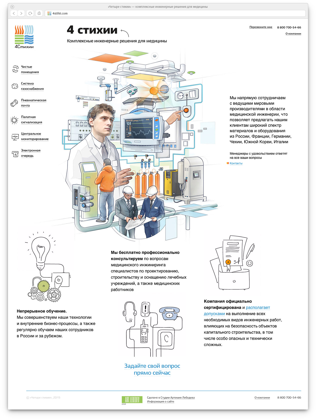 Chetyre Stihii supplies hospitals, pharmacies, maternity homes and clinics with medical equipment for disinfecting air, transporting gases, space heating, moving cargo and monitoring patients. A website where each of the company’s lines of business is presented with a vivid and lively illustration was created at the studio.