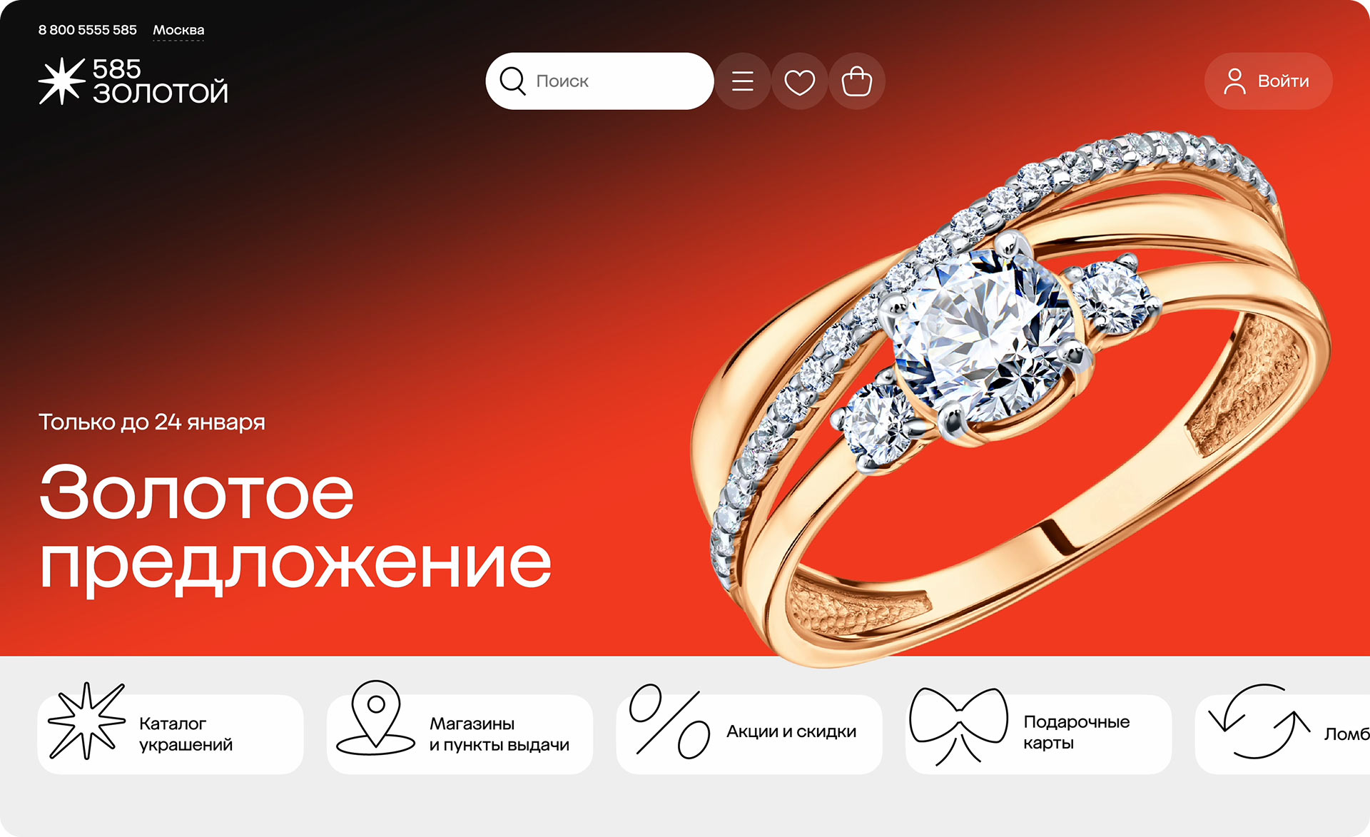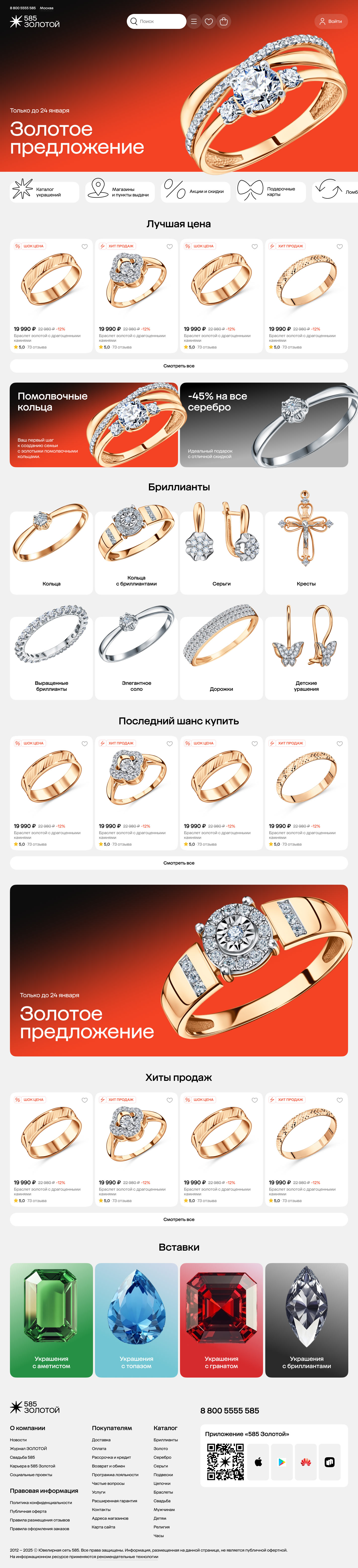 The main page showcases the full variety of jewelry and highlights special offers, discounts, promotions and personalized recommendations, instantly immersing users in the product range.