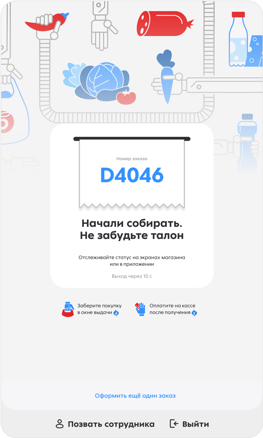 While the order is being placed, friendly animations on the lower screens visualize the item picking process and subtly highlight the brand’s core values.