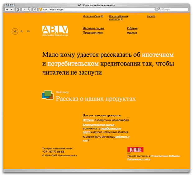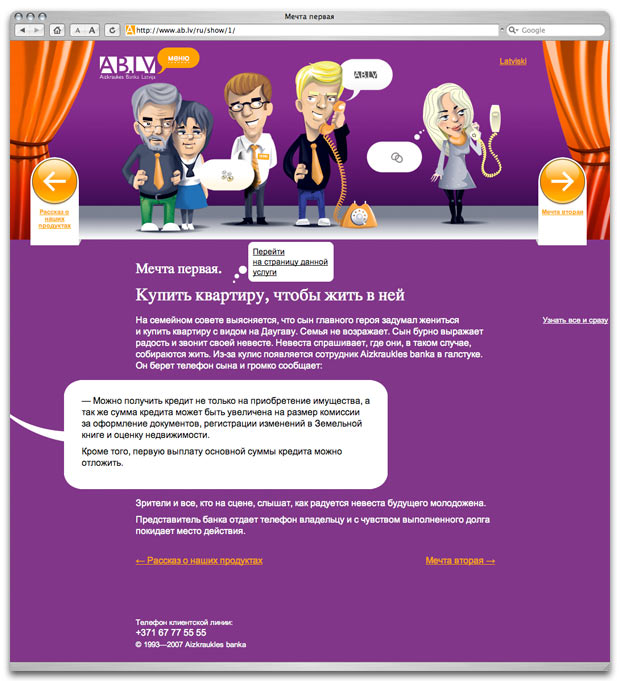 Visitors of the website learn more about the credits from a site-show. Its characters make their dreams come true with the help of AB.LV. ![]() Scene 2, Dream 1