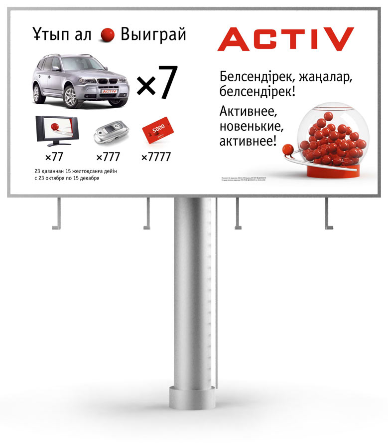 Weve designed print ads for magazines and newspapers, leaflets, sandwich board signs, outdoor advertising materials of all kinds (from lightboxes to billboards), ATM screensavers, advertising bus handlesa total of 52 promotional items in Russian and Kazakh.