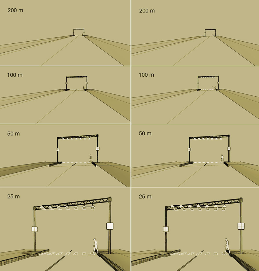 Holding virtual testing. The distance to the structure matches average stopping distance of a car moving at 60 km/h (40 mph) in various weather conditions. Views from control points show that lamp dimensions make little difference, which means they don’t necessarily have to repeat dimensions of road markings below them.