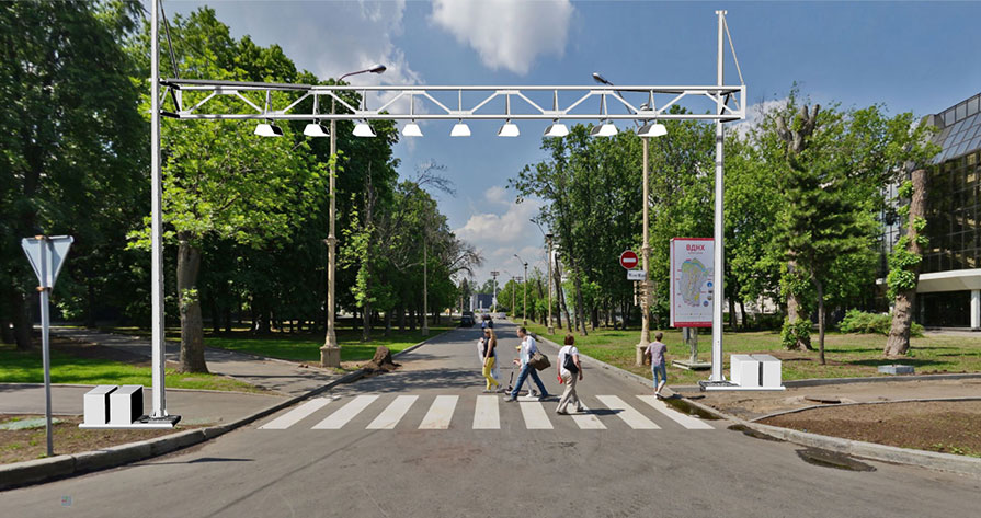 We receive an offer to install Air Crosswalk at VDNKh. The artistic director suggests to go back to the crossbar with L-shaped columns. This makes the structure look lighter and simplifies lamp suspension.
