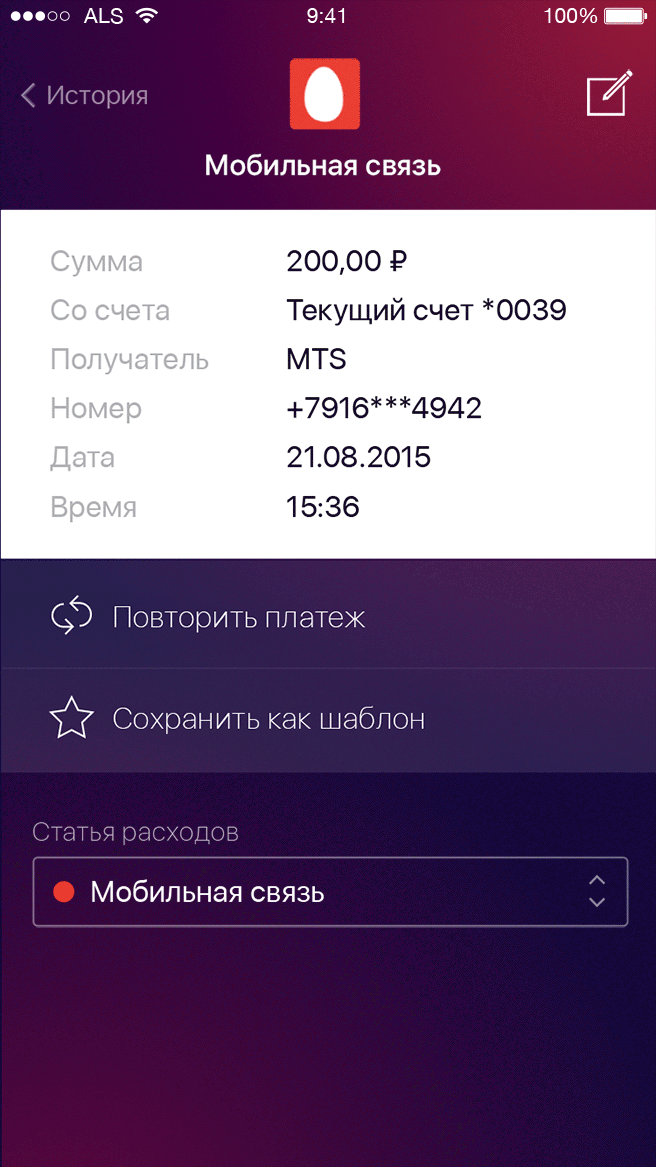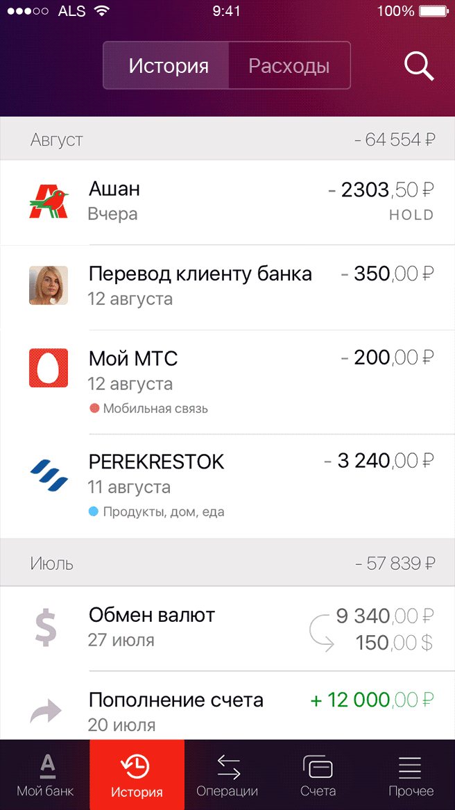 All payments and transfers made in the bank are saved in a special section. A simple search and a set of filters make the long list of transactions easily manageable.