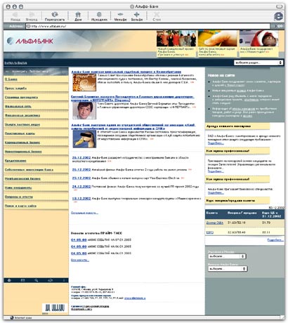 The site has intelligence of its own. Art. Lebedev Studio-developed Demograph enables to obtain the visitors locationit detects whether he/she is visiting from a financial institution, a publishing house or from home with 95% accuracy. And accordingly, the first thing to appear before a potential corporate client is the credit section, for a journalist its media information, and an individual sees the credit cards page. Demograph utilizes database information collected by us within three years. Redesigned navigation features detailed menu containing main section links on the left. Double page-to-page navigation allows you to conveniently switch between sections and quickly return to the home page. This website is a classic style information resource built using tables that stretch to the browser width. Announcements appearing on the front and internal pages bring forward the latest news. The site thoroughly makes thorough use of Ushki, an invention of ours (see Gazeta.ru). Another helpful feature is a convenient online calculator for figuring deposit amount. |