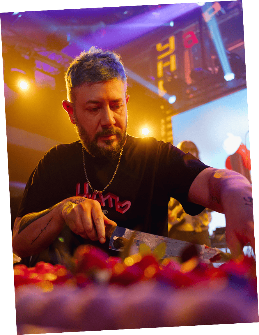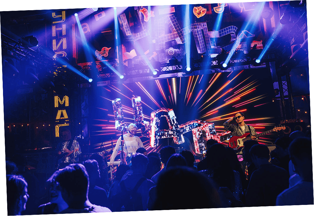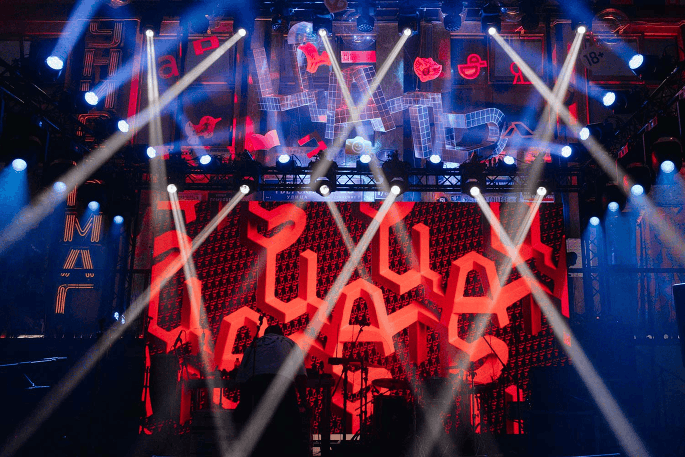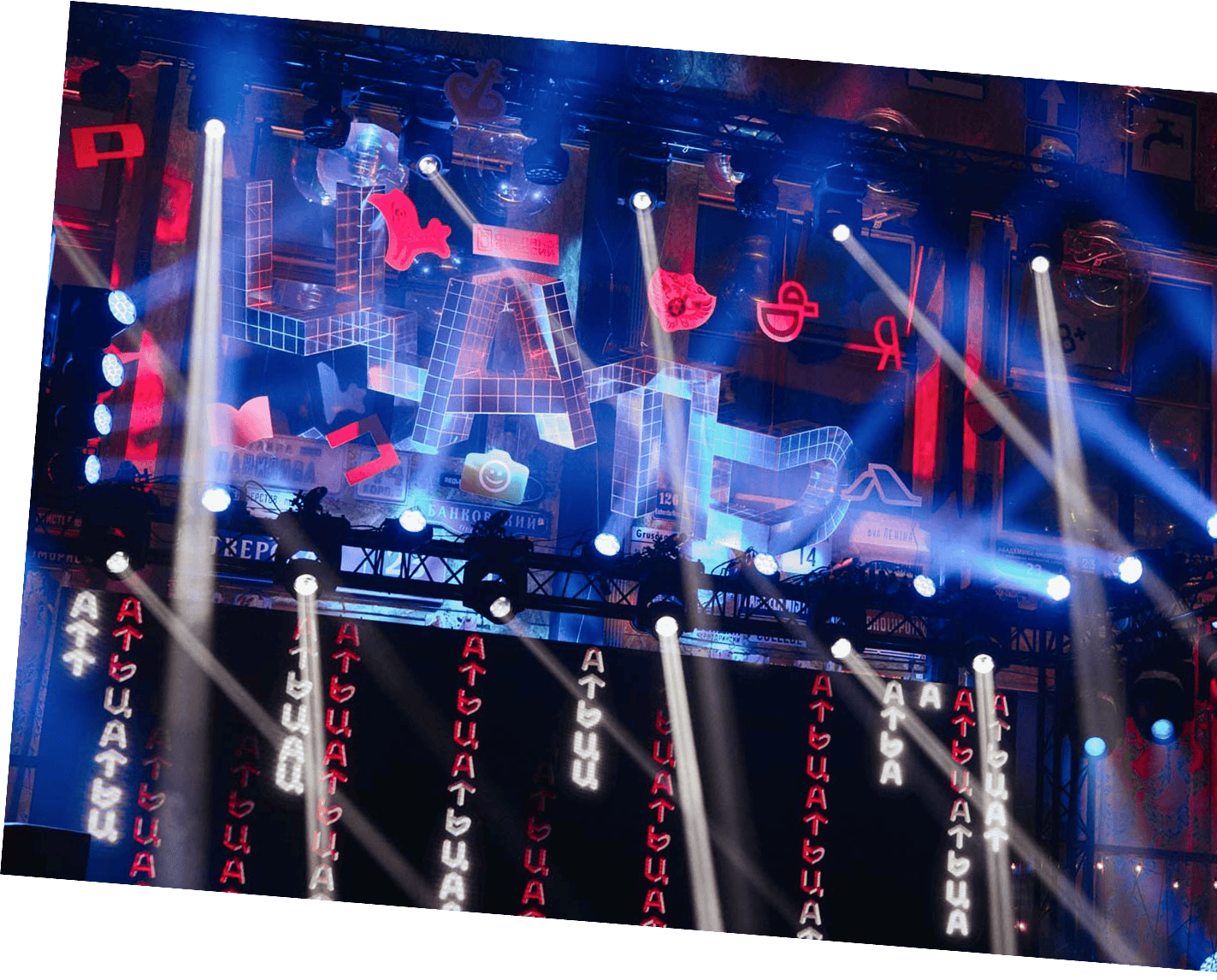 To create a wildly vibrant and out-of-this-world atmosphere for the studio’s birthday party, a motion version of the super-popular Tsat identity was developed. The unified graphic system was designed to decorate any surface: it looks equally striking on the video wall by the main stage and on the TV screens in the immersive photo zone.