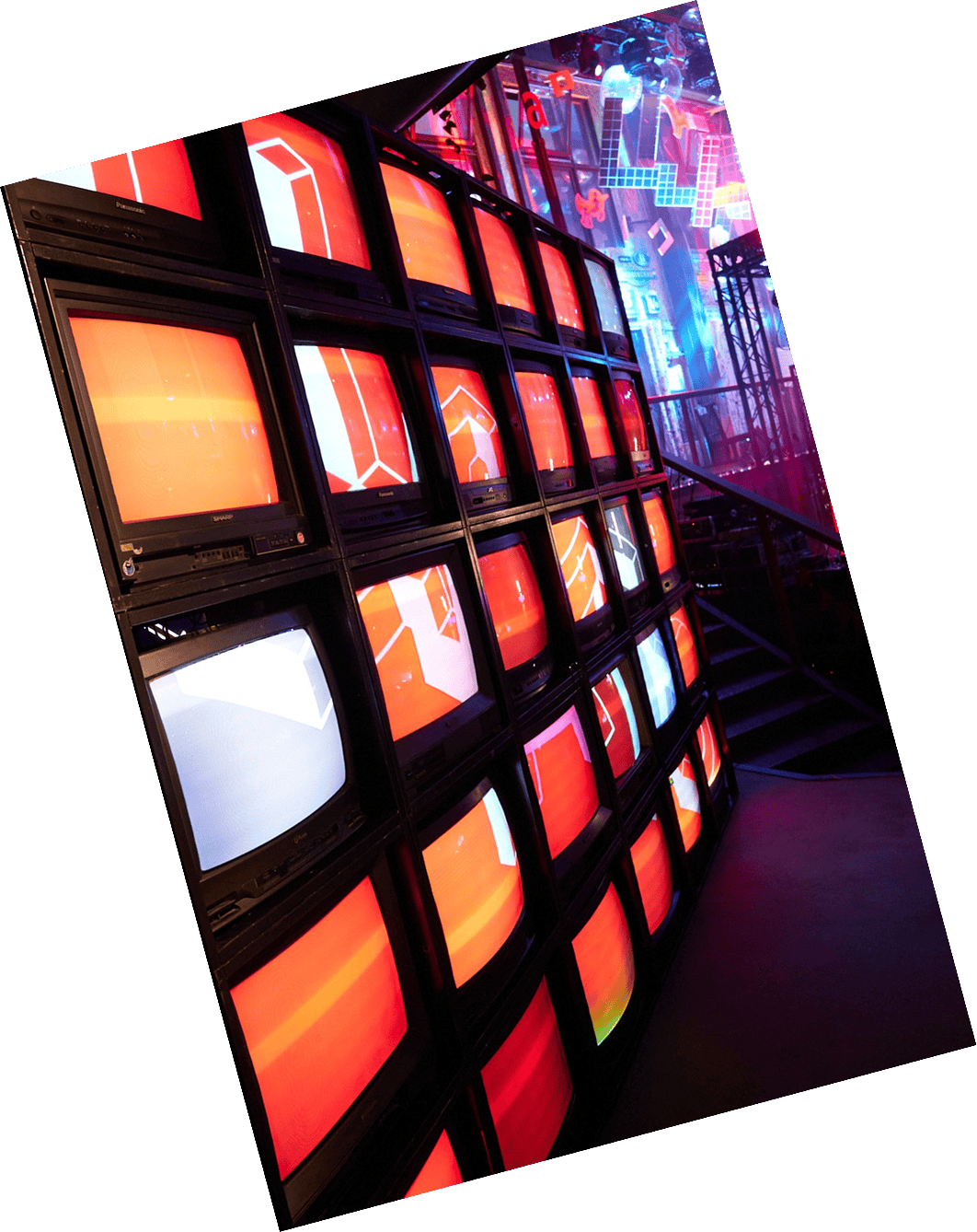Countless elements of motion graphics transformed the entire studio space into a curious meeting point of childhood-era technology and cutting-edge digital innovation.
