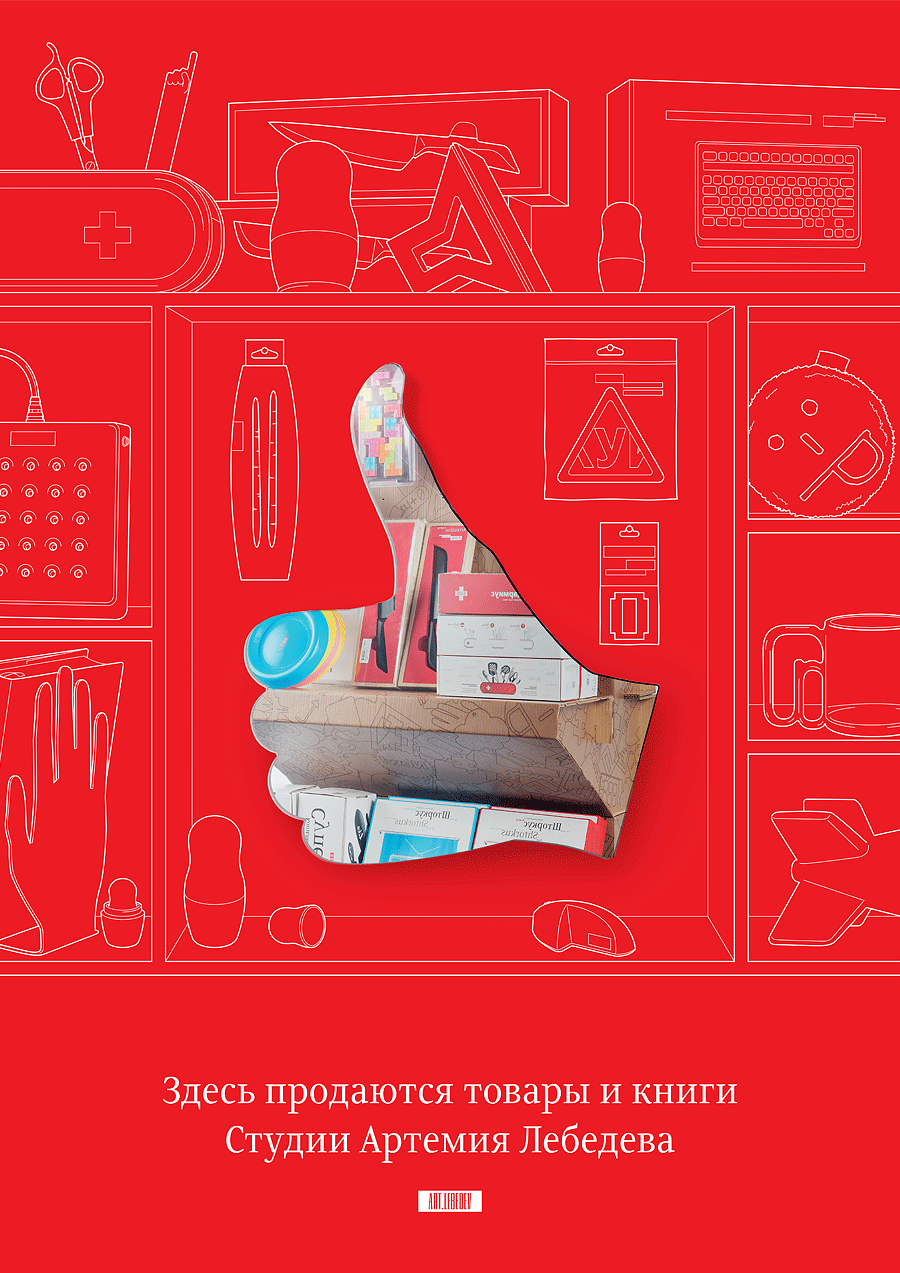 The poster tells the visitors of a store that the traditional product range has been complemented by shelves with studio’s books and products.