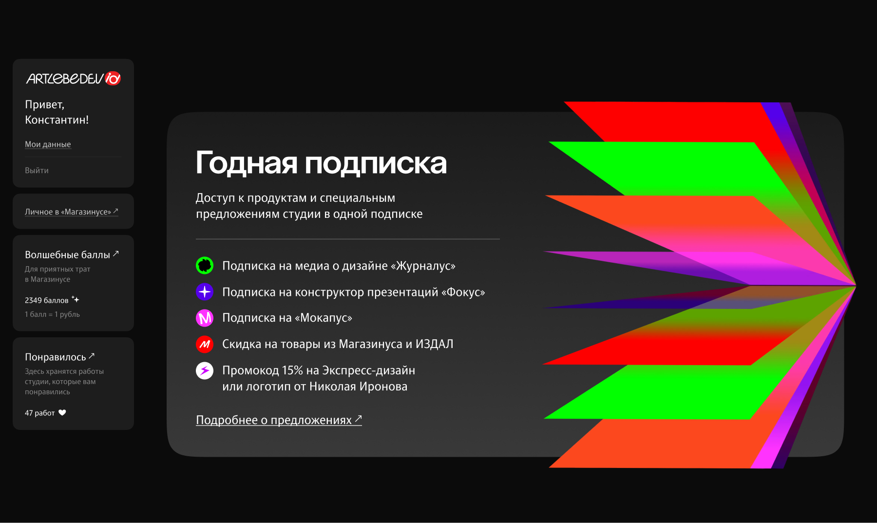 Every day, thousands of people visit the studio’s website to solve various tasks: they make purchases in “Magazinus”, subscribe to our useful services, and order design. To make it pleasant and comfortable for people to interact with the website, we created “Artlebedev ID” — a personalized showcase for quick access to all our products.