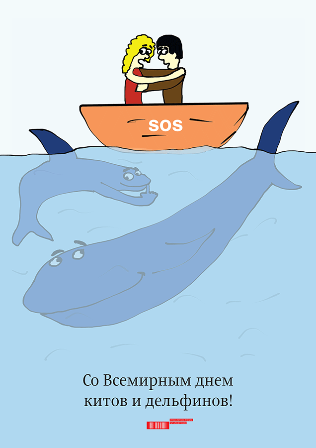 The World Whale and Dolphin Day is celebrated on July 23. The poster congratulates the viewers with the fact that killing marine mammals for profit is completely forbidden in the modern world.
