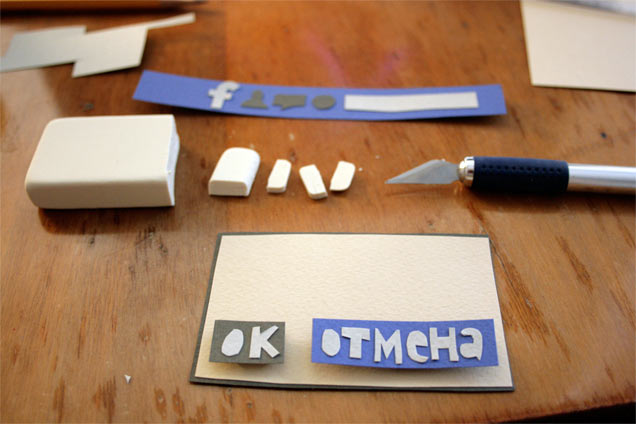 Why not make it all out of paper? Cutting out the painfully familiar Facebook page. Putting pieces of eraser in between layers to give it more volume.