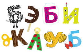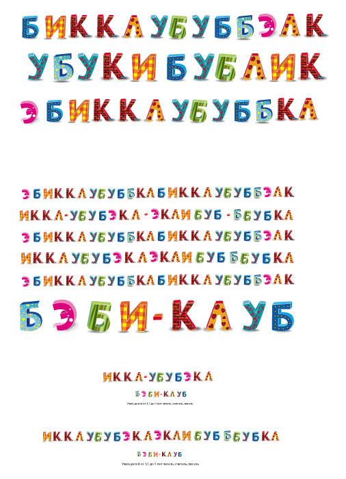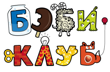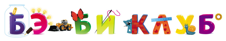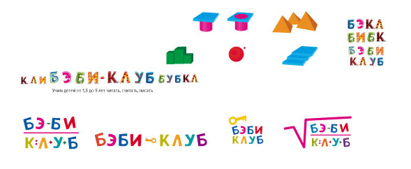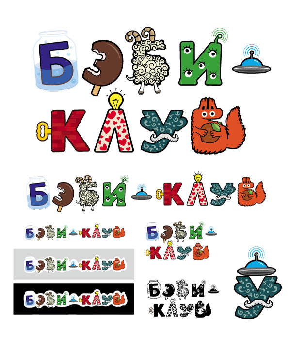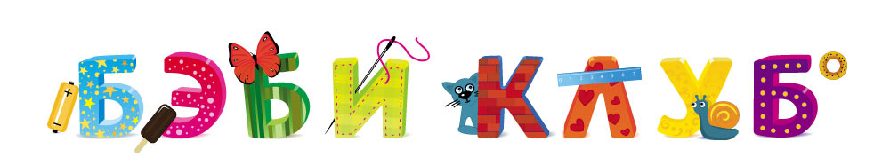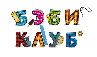 И as an alien (though it lacks readability at this stage). Б as a squirrel (which here looks more like a fox). The balloon stands for the hyphen (in Russian the name is spelled БЭБИ-КЛУБ).