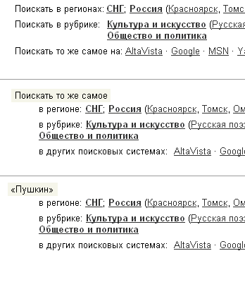 An example of optimization of a Yandex search page fragment: the repeated part (the word search) is transferred to the general part of the list and then replaced with a more informative text (Pushkin)