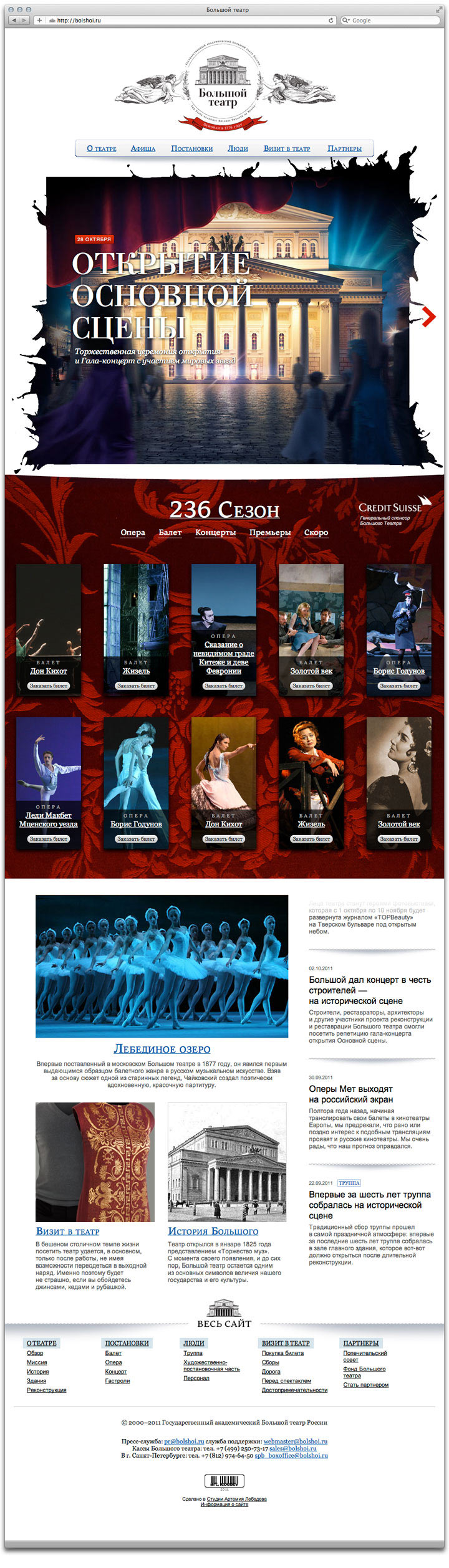 The Bolshoi Theater website offers performance schedules, artists’ biographies, production details, photo and video, news, directions, and much more—all presented in a festive, special-event package together with a simple and convenient interface. Start your special evening early by checking the production details, brief narration, photos, and extras on the theater’s website.