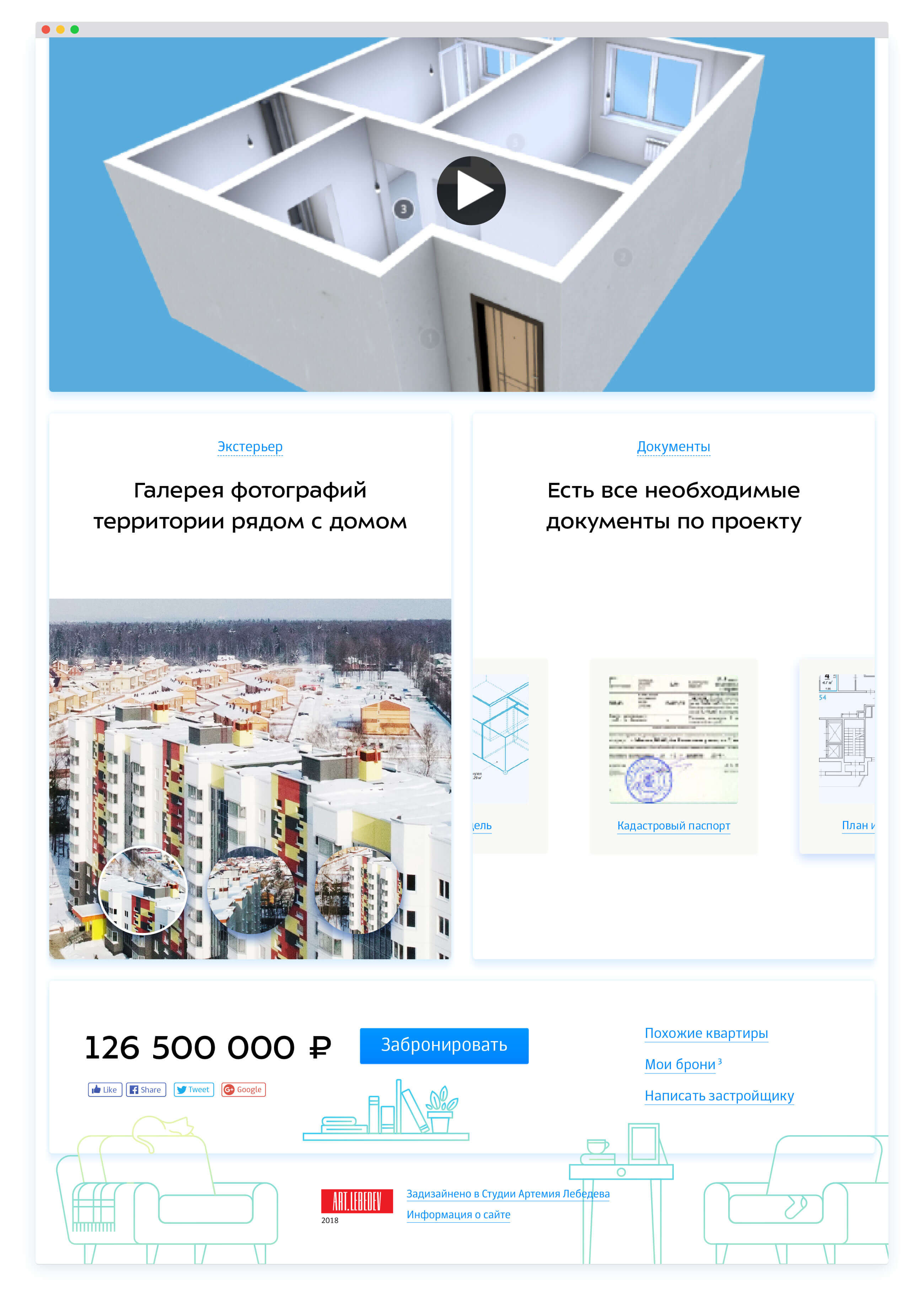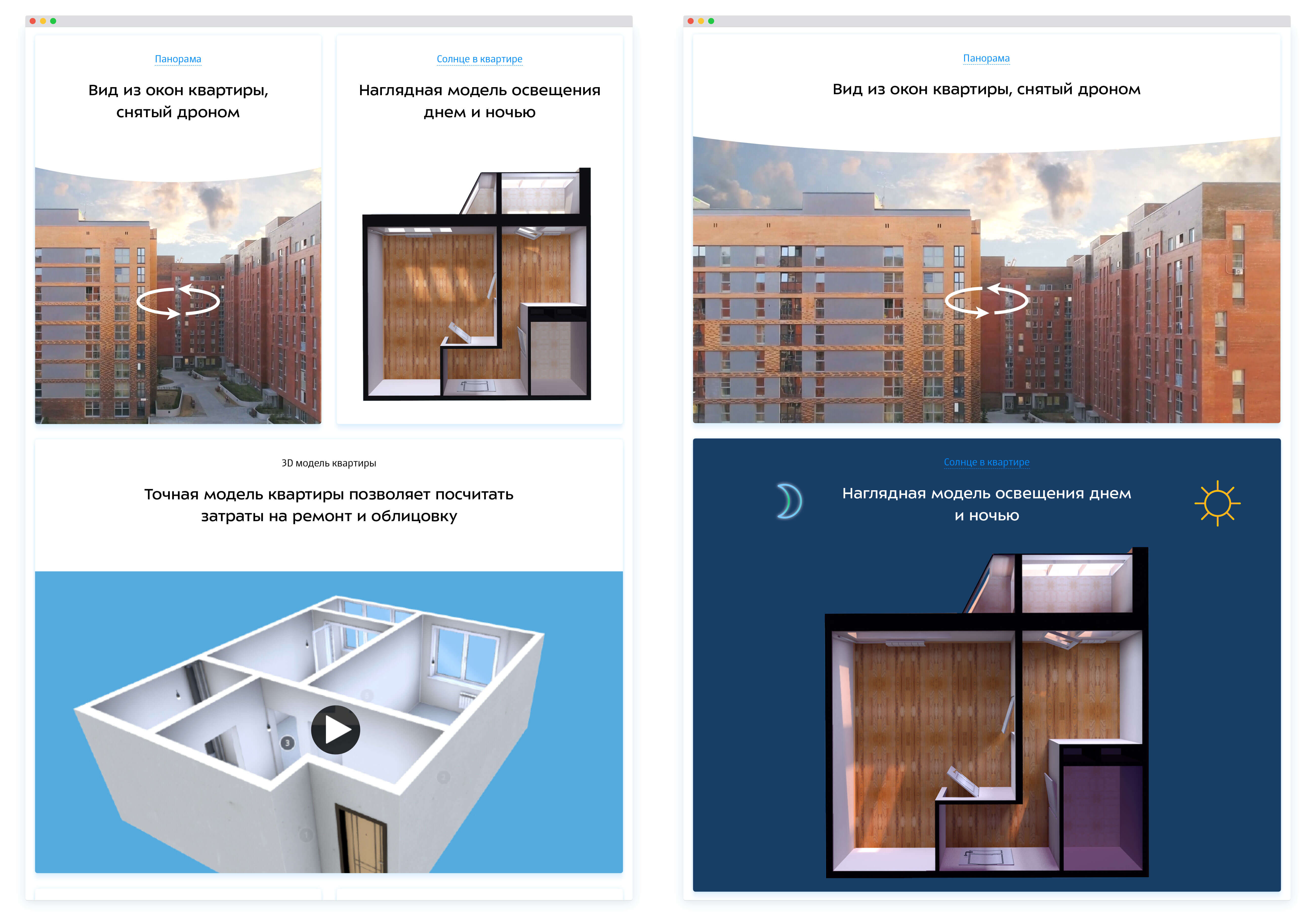 Secondary but also interesting information is arranged in narrow blocks. Expanded modules show users the view from the windows of their future apartment and what the kitchen looks like flooded with moonlight.