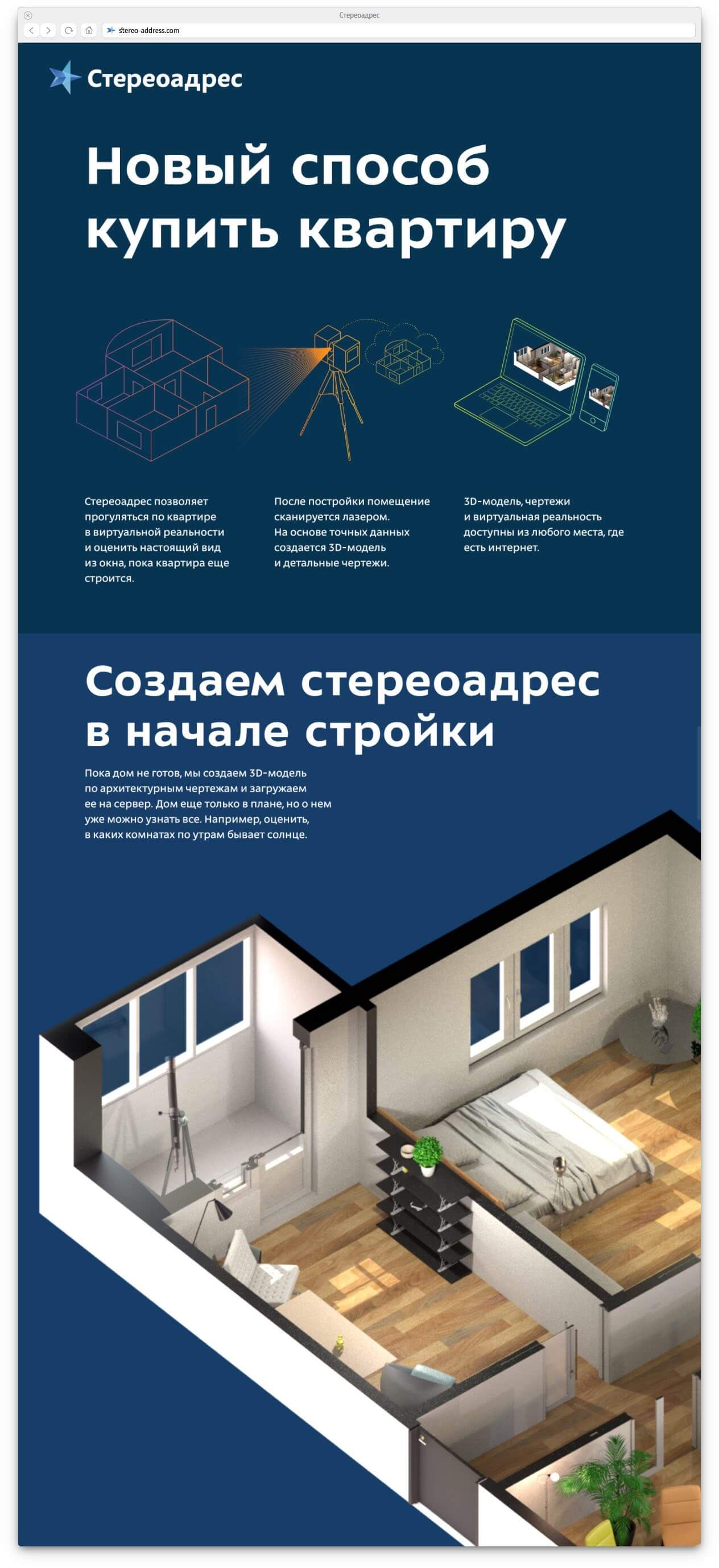 Stereoaddress is a service that provides all owners, buyers and renters 3D cadastral passports of their apartments, both existing and planned. Information of what a cadastral passport is, how it’s created and used is presented on a promo website developed at the studio. It contains beautiful images, a 3D model of a space, virtual reality elements and a variety of useful information about the new format.