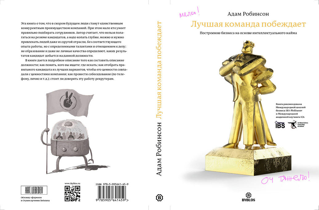 Receiving the final images. The idol on the title is now placed perfectly, but the robot with the brains on the back just doesn’t look right: it’s too detailed and doesn’t match the idol well. Making the decision to remove the robot altogether, especially since that now we have the text above it that was proofread by the editor. Replacing the robot with a decorative quotation mark to put an emphasis on the expert’s review of the book. Between the French and English quotation marks we choose French and color them in gold, similar to the book’s title on the front cover and the spine. Pure beauty!