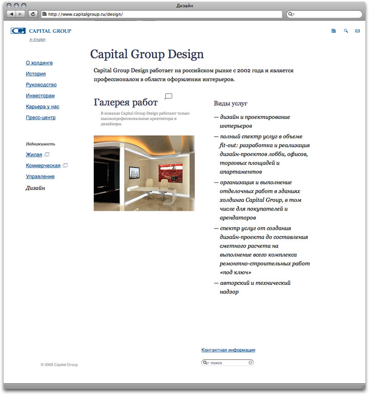 Capital Group has been in business for 17 years. Their new website provides information on the holding and directs its visitors to where they can find out more about commercial and residential property markets. ![]() Front page features the beautiful Capital City
