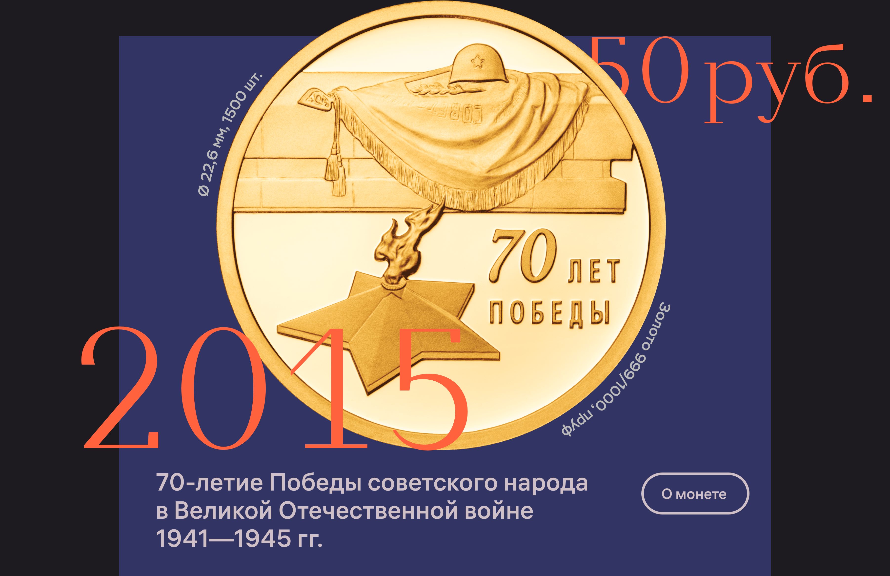 The Bank of Russia Museum held an online exhibition of coins for the 75th anniversary of victory in the Second World War. The studio helped make “showcases” for the coins and came up with a wonderful animation that allows to examine the coins in detail. Denomination and year of issue are indicated for each coin. By clicking the About Coin button, visitors of the exhibition can open a description that contains interesting information about the events depicted on the coin as well as its size, circulation and material.