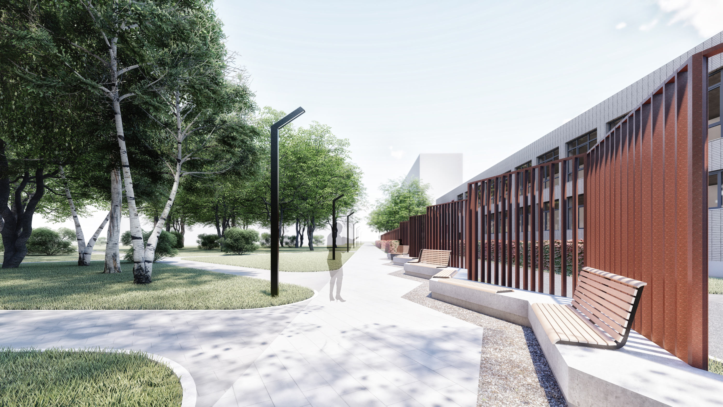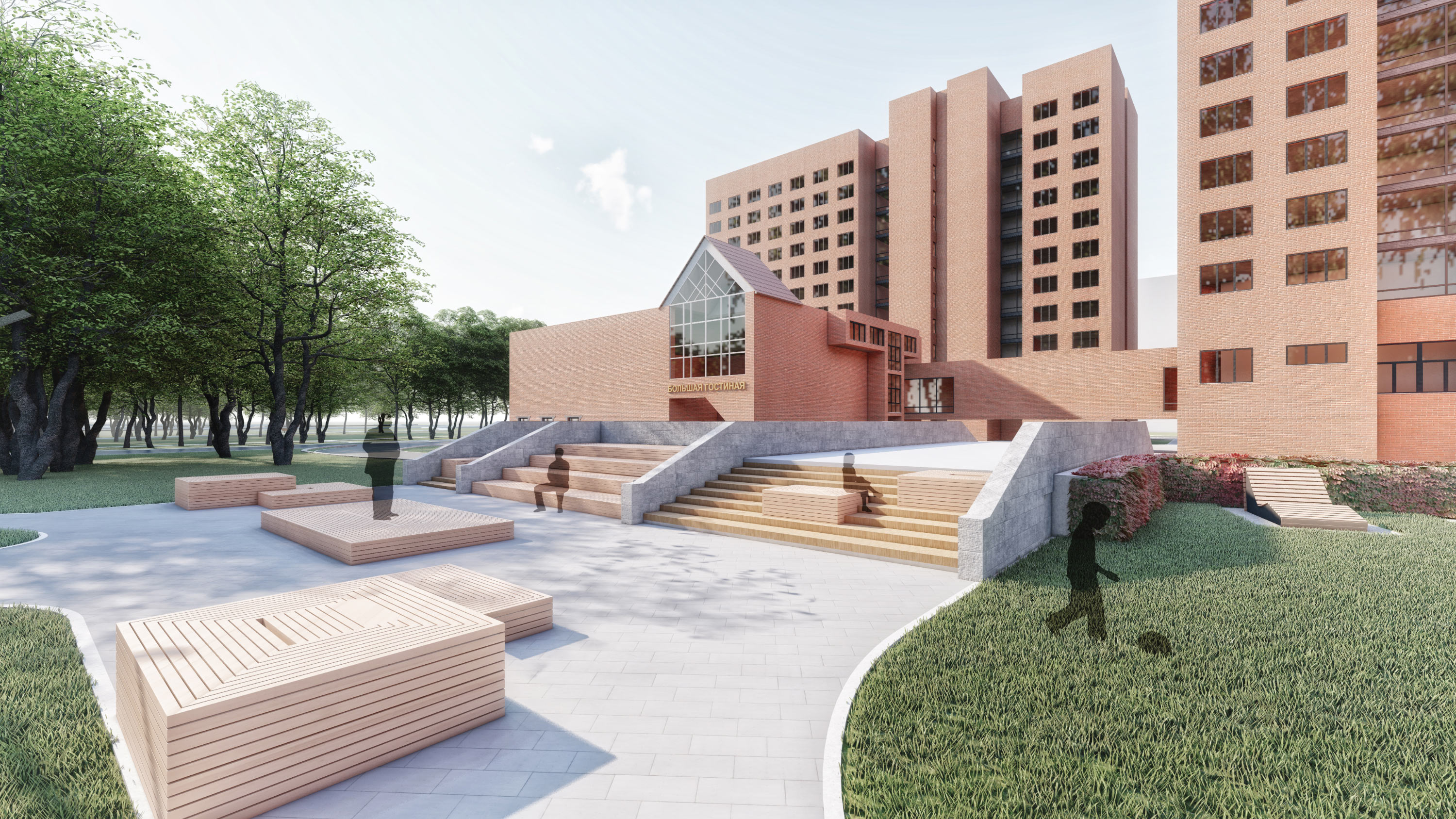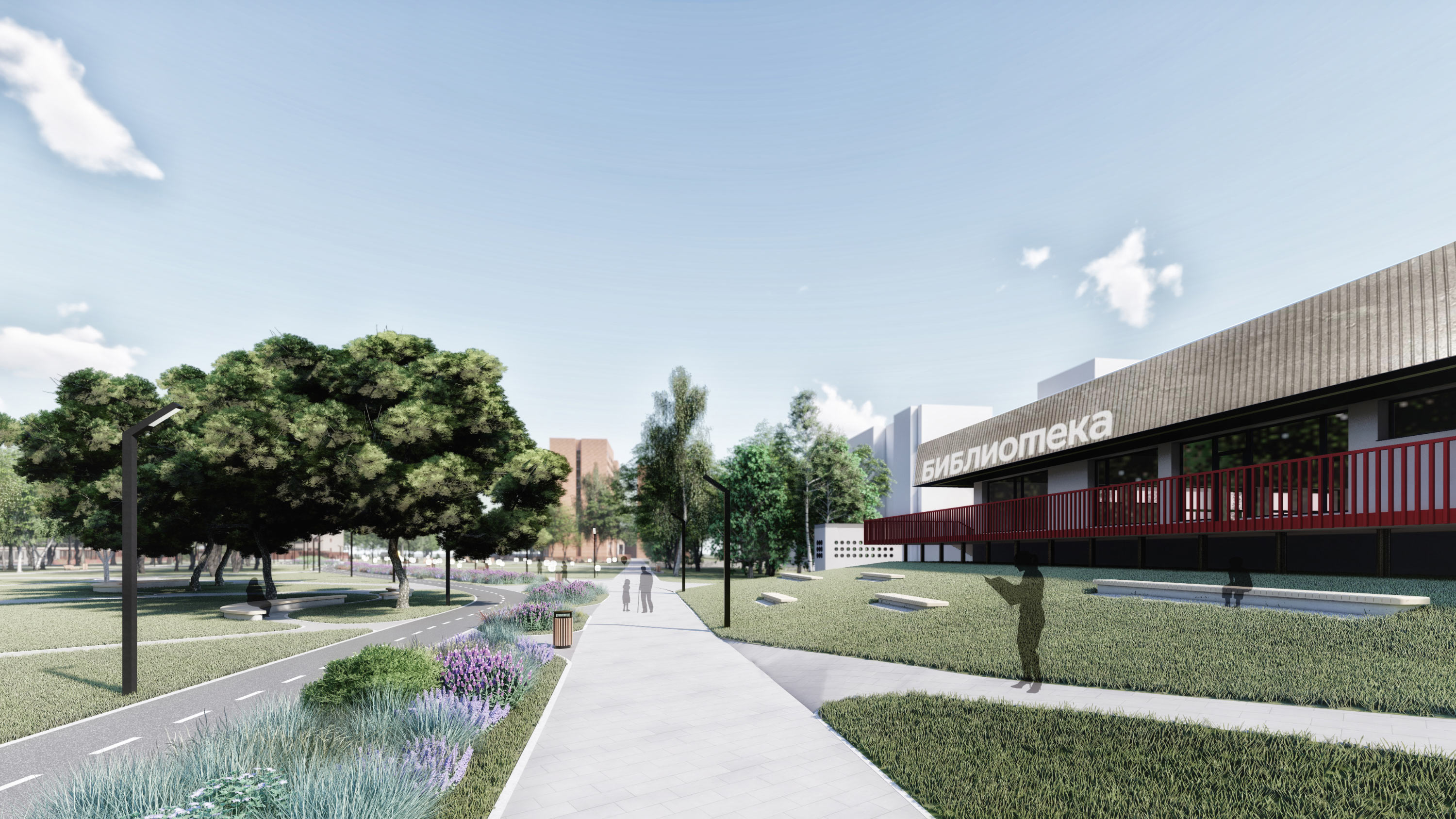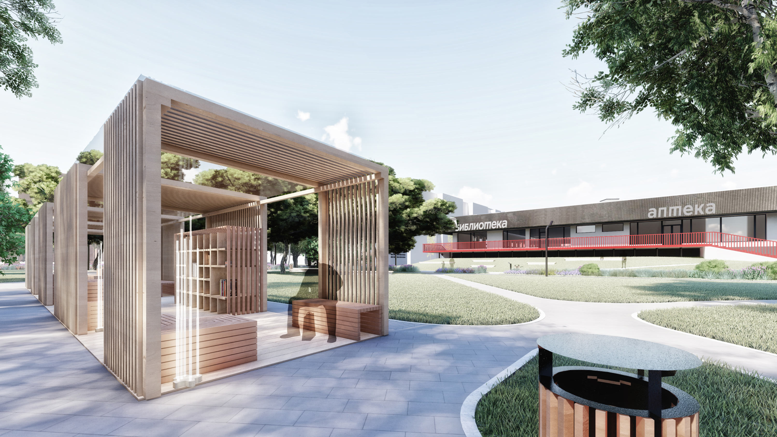 At this point, Shkolny Boulevard connects with Zolotogo Boulevard. The adjacent boulevard begins at the local library in Dom Byta. Here, we place laconic gazebos with street libraries inside, as well as long benches, which make the beautiful rise of elevation near the building walls more visible.
