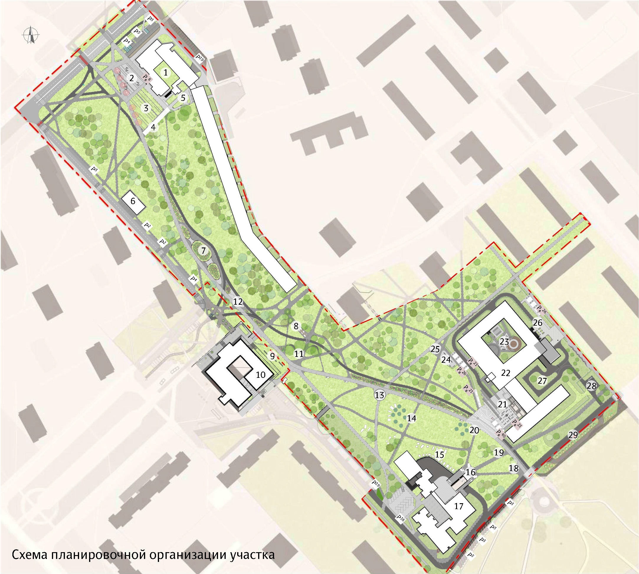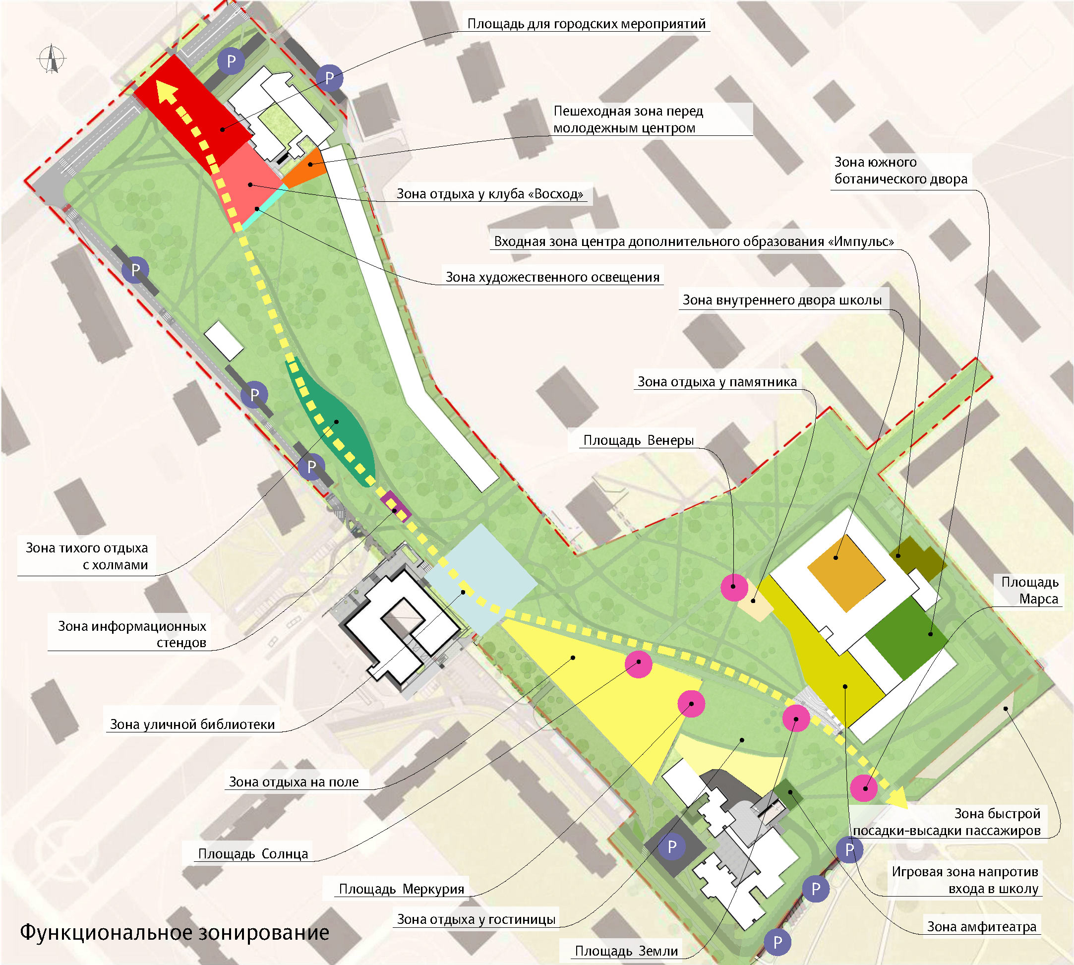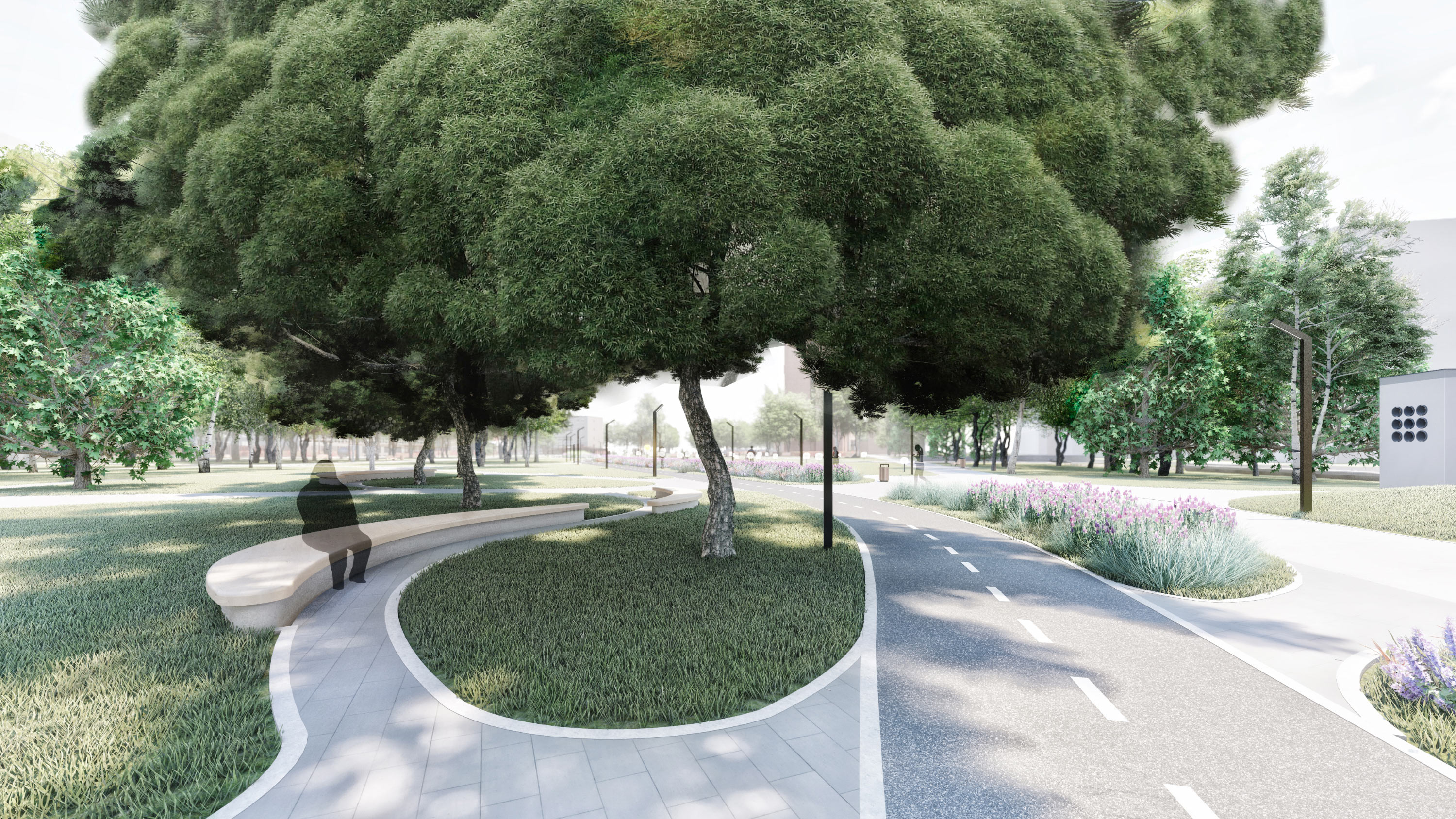 The concept is based on the idea of a gradual progression from strict and ceremonial geometry near Institutsky Avenue to smoother and more natural lines by the entrance to the Yuzhnoye Ozero recreation area.