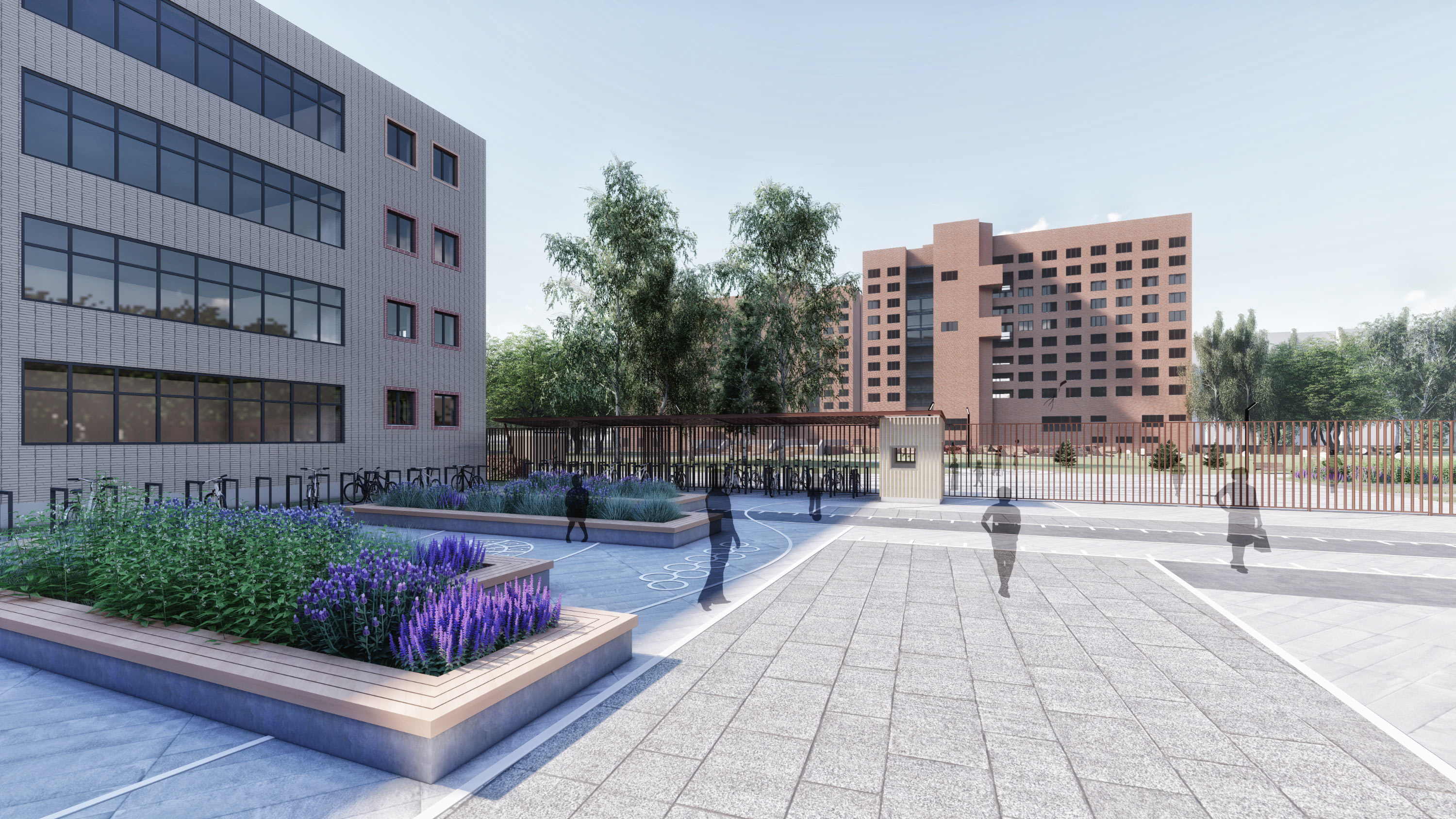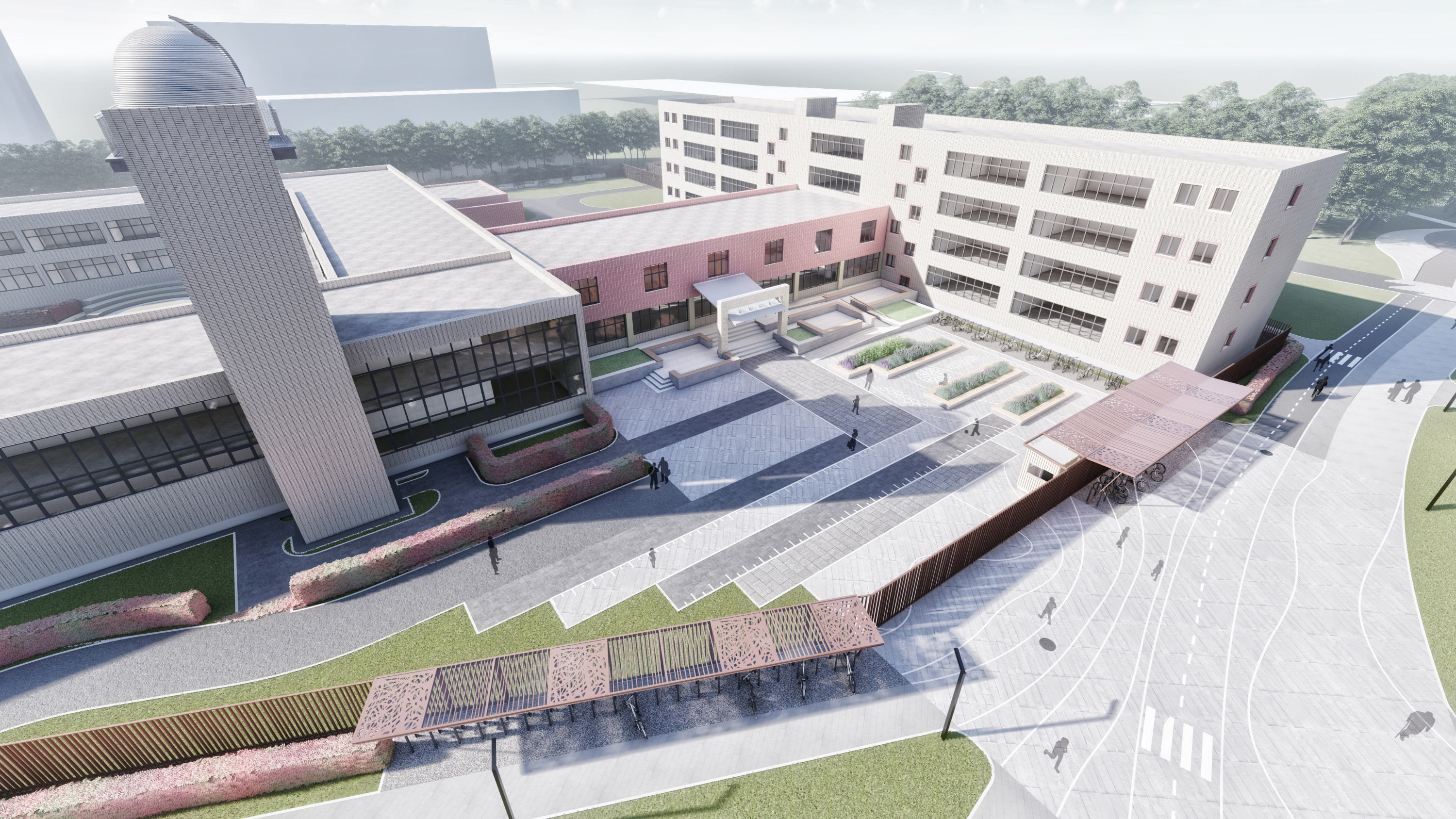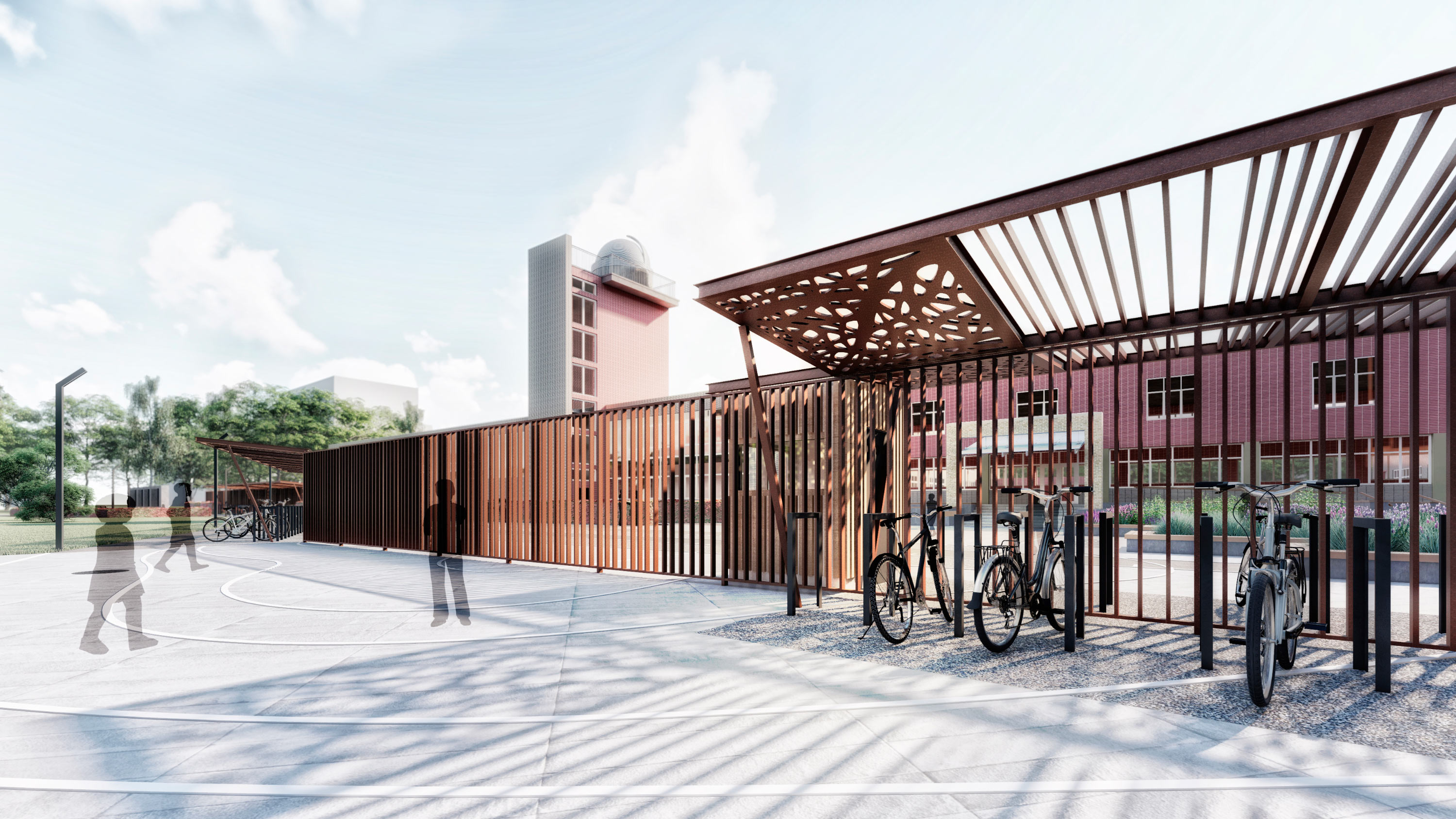 The school fence is combined with convenient bicycle parking and seating areas.