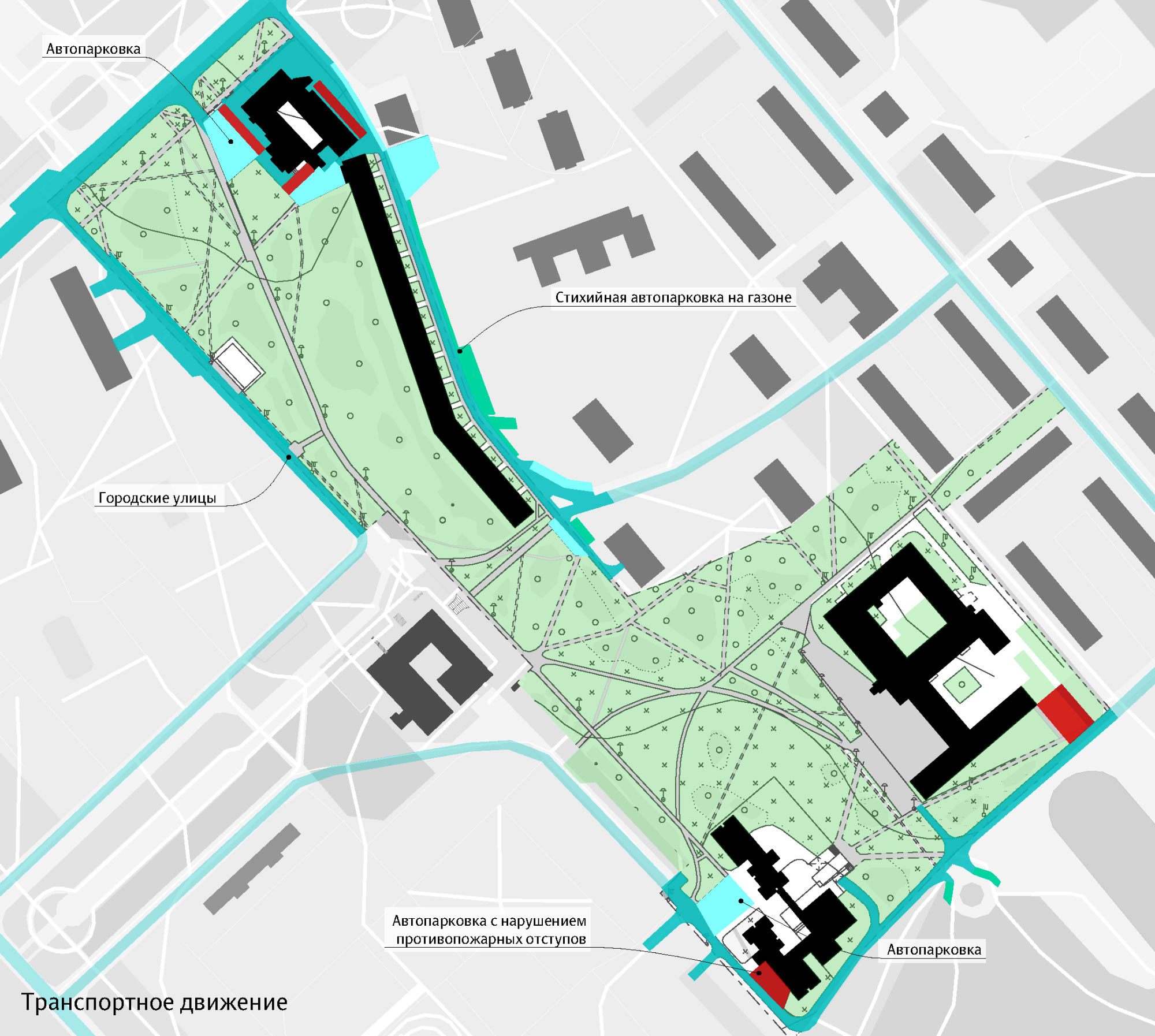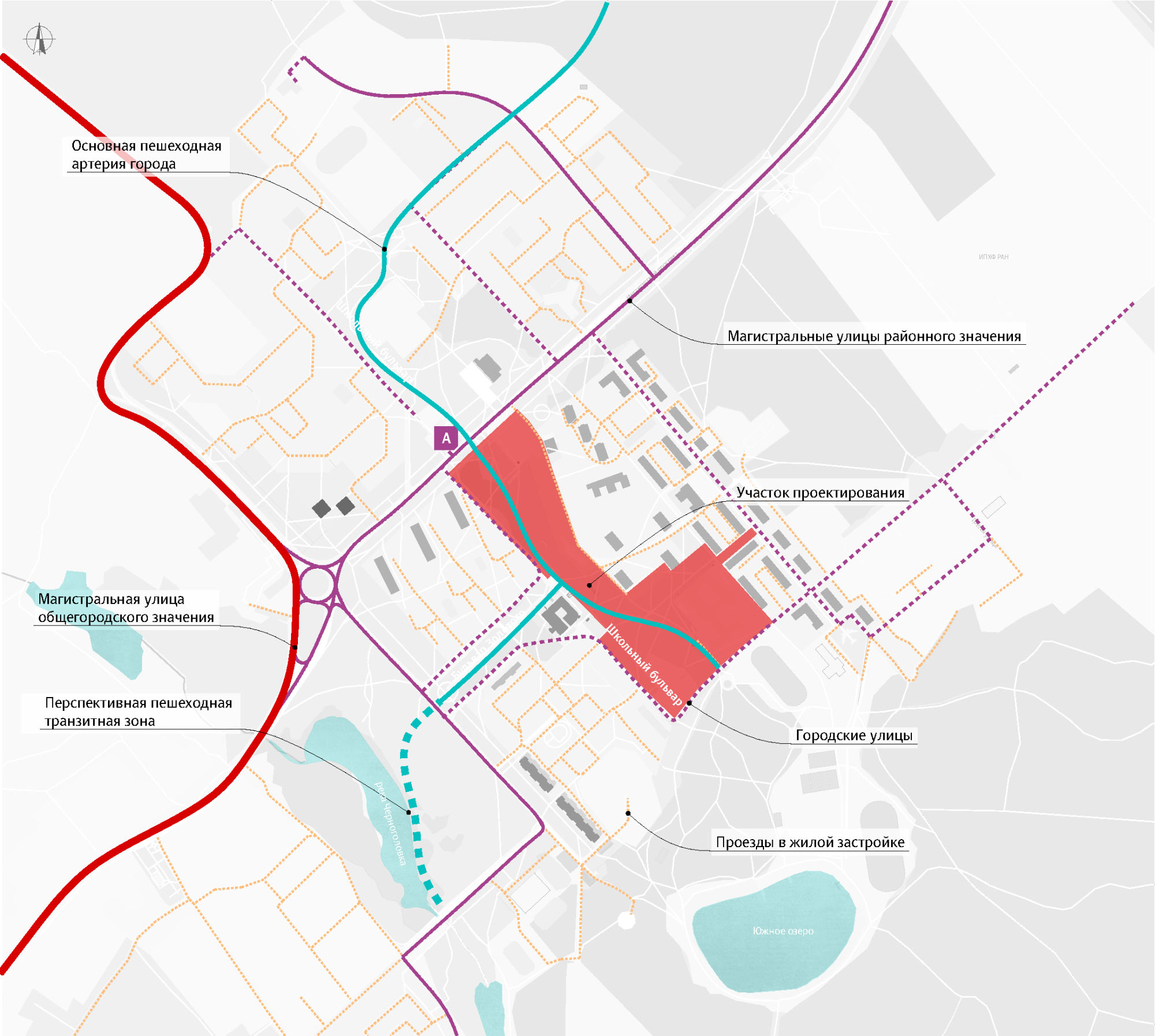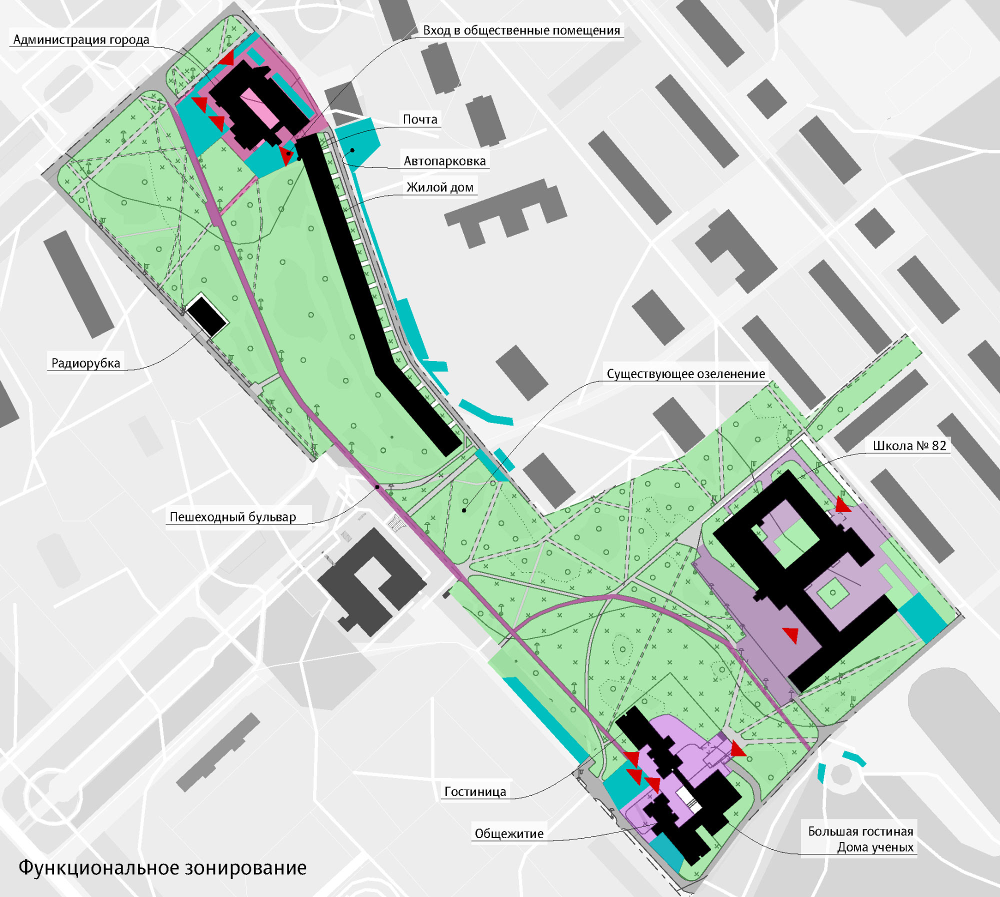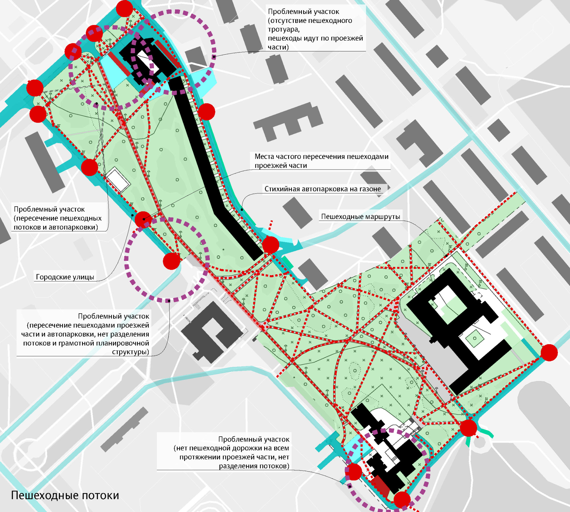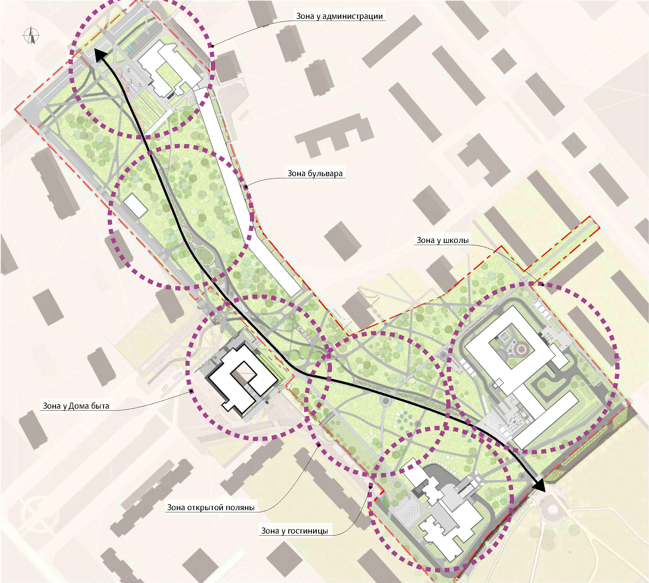 To organize the main pedestrian route of the city in the best way possible, we analyze connections of the boulevard with the street network, pedestrian and vehicle travel paths and take into account the location of nearby buildings and green spaces.