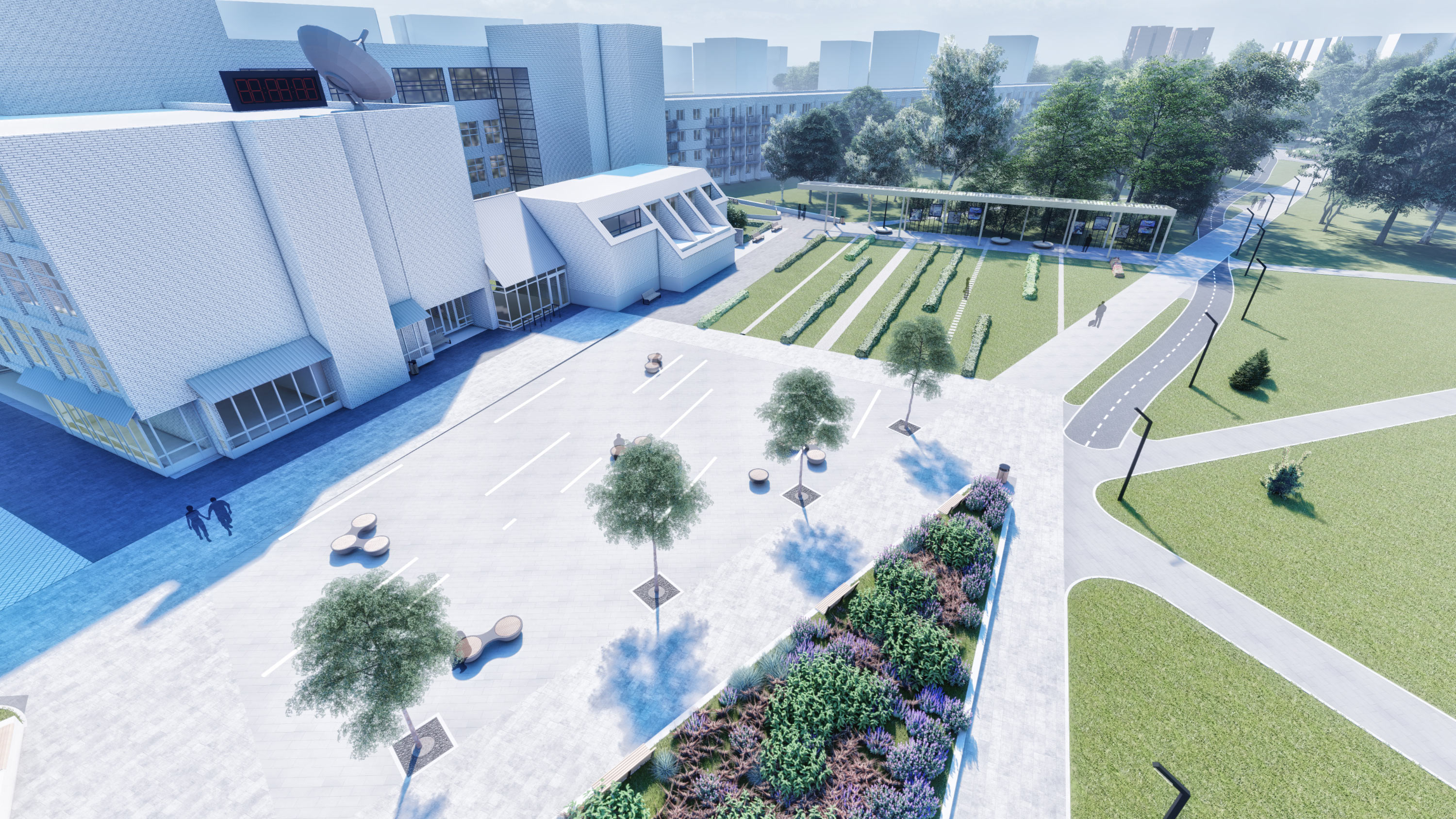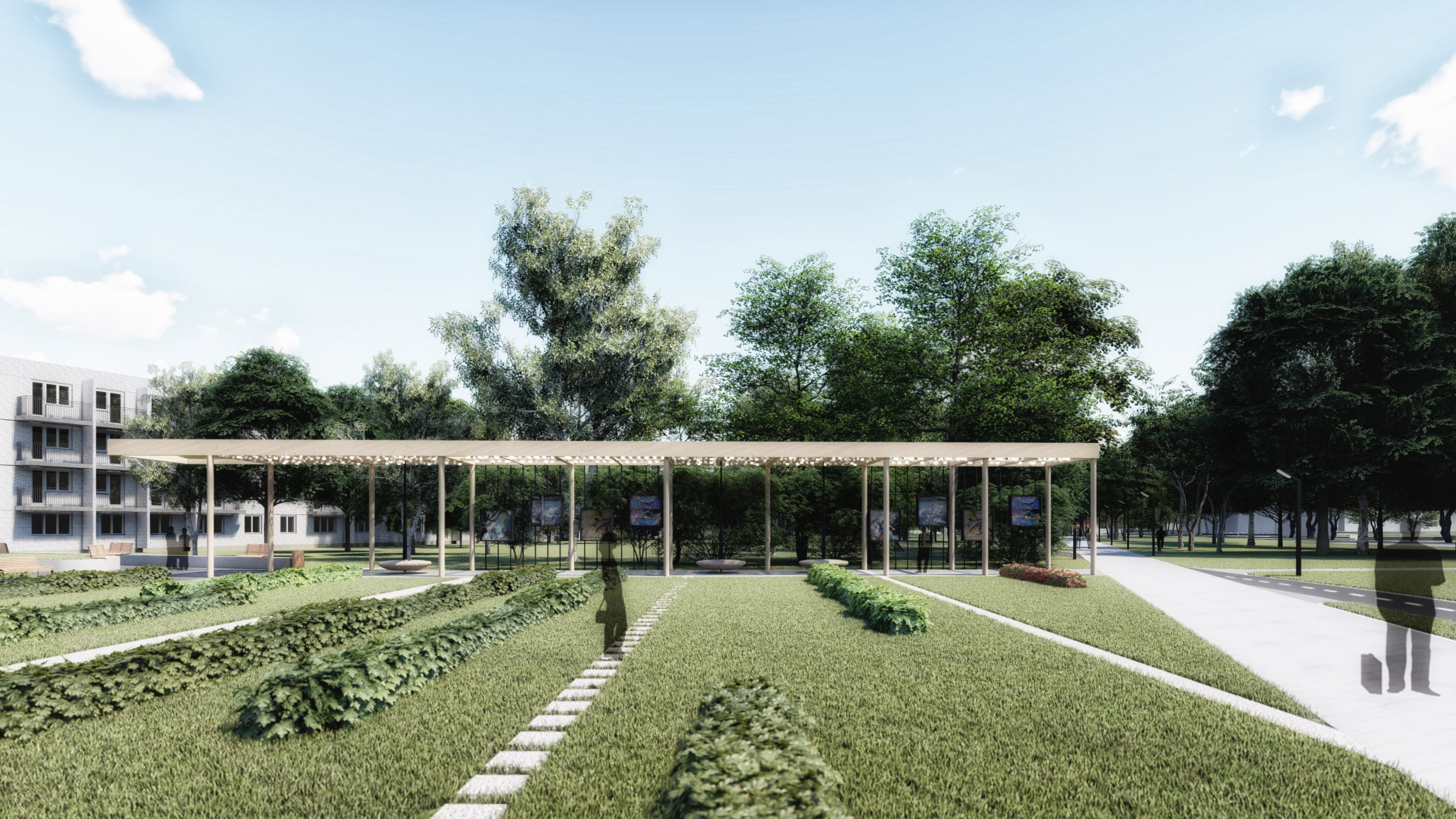 The boulevard’s intersection with the avenue has already become a popular meeting place. That’s why a light, picturesque pergola with unusual round seating and an exposition space will come in especially handy here.