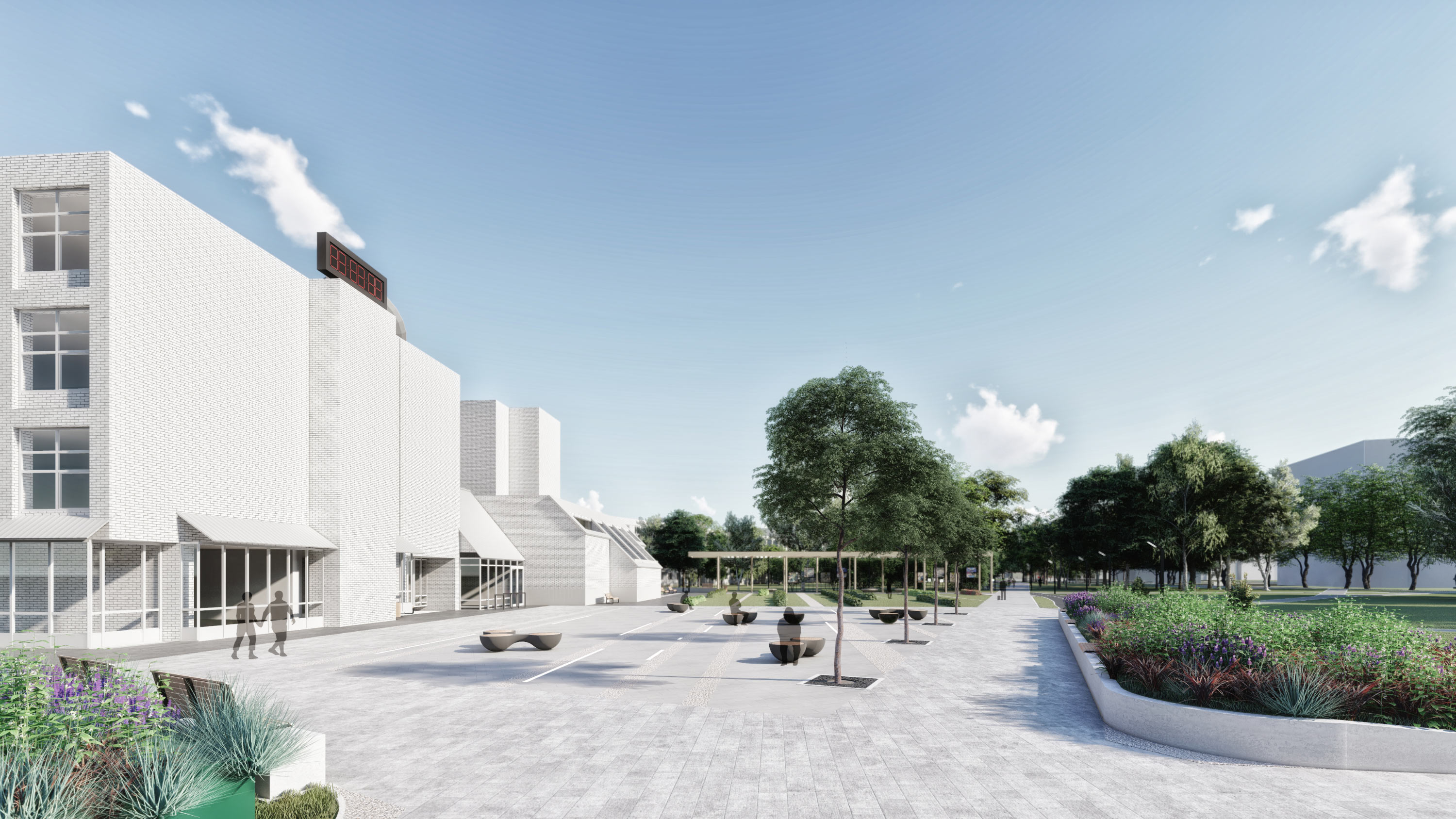 At the intersection of Shkolny Boulevard with Institutsky Avenue we create a square with pedestrian priority. This removes a barrier in the way of visitors and makes the space safer. The square is also great for various city events, concerts and fairs.