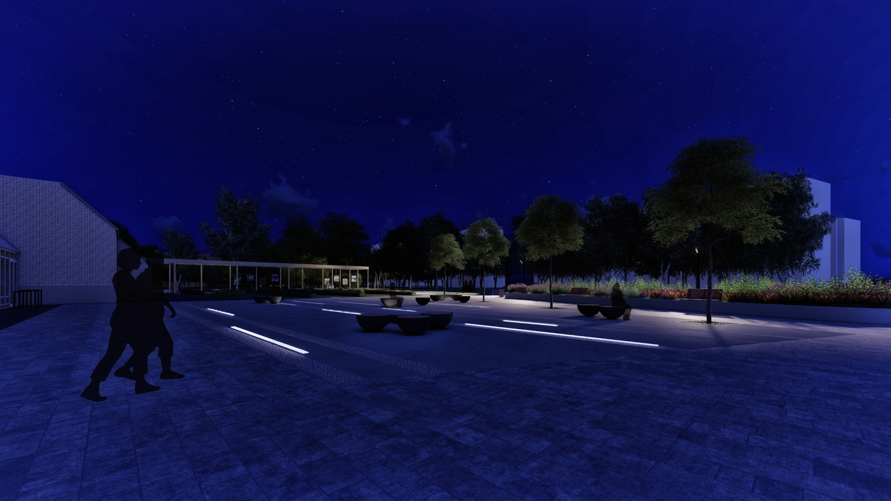 The zoning of the boulevard is based on a multitude of user scenarios and divides it into the square by the city hall building, the recreation area, the space in front of Dom Byta, the clearing by the hotel and the surroundings of School No. 82.