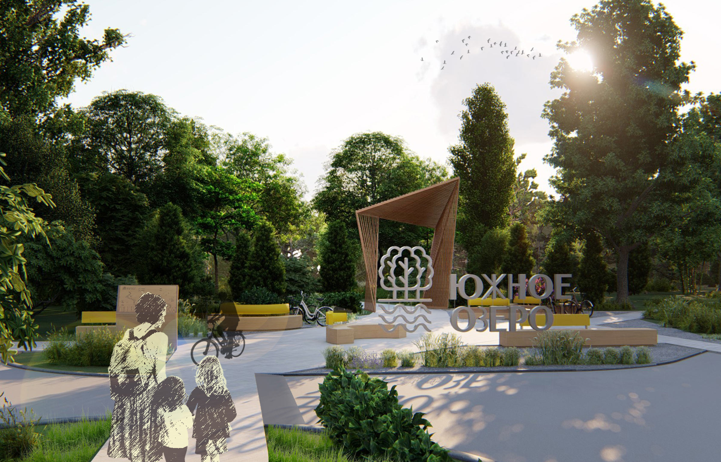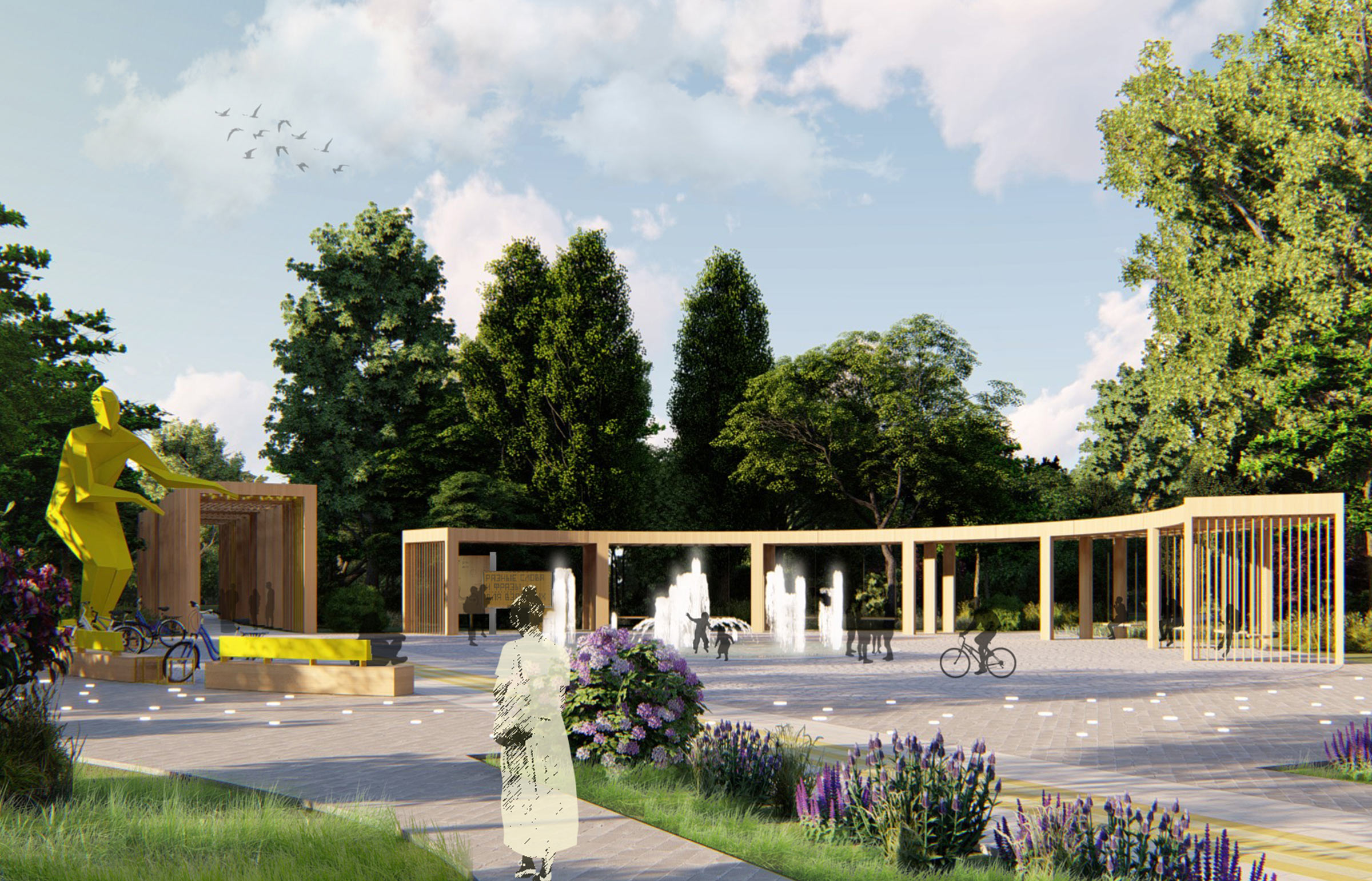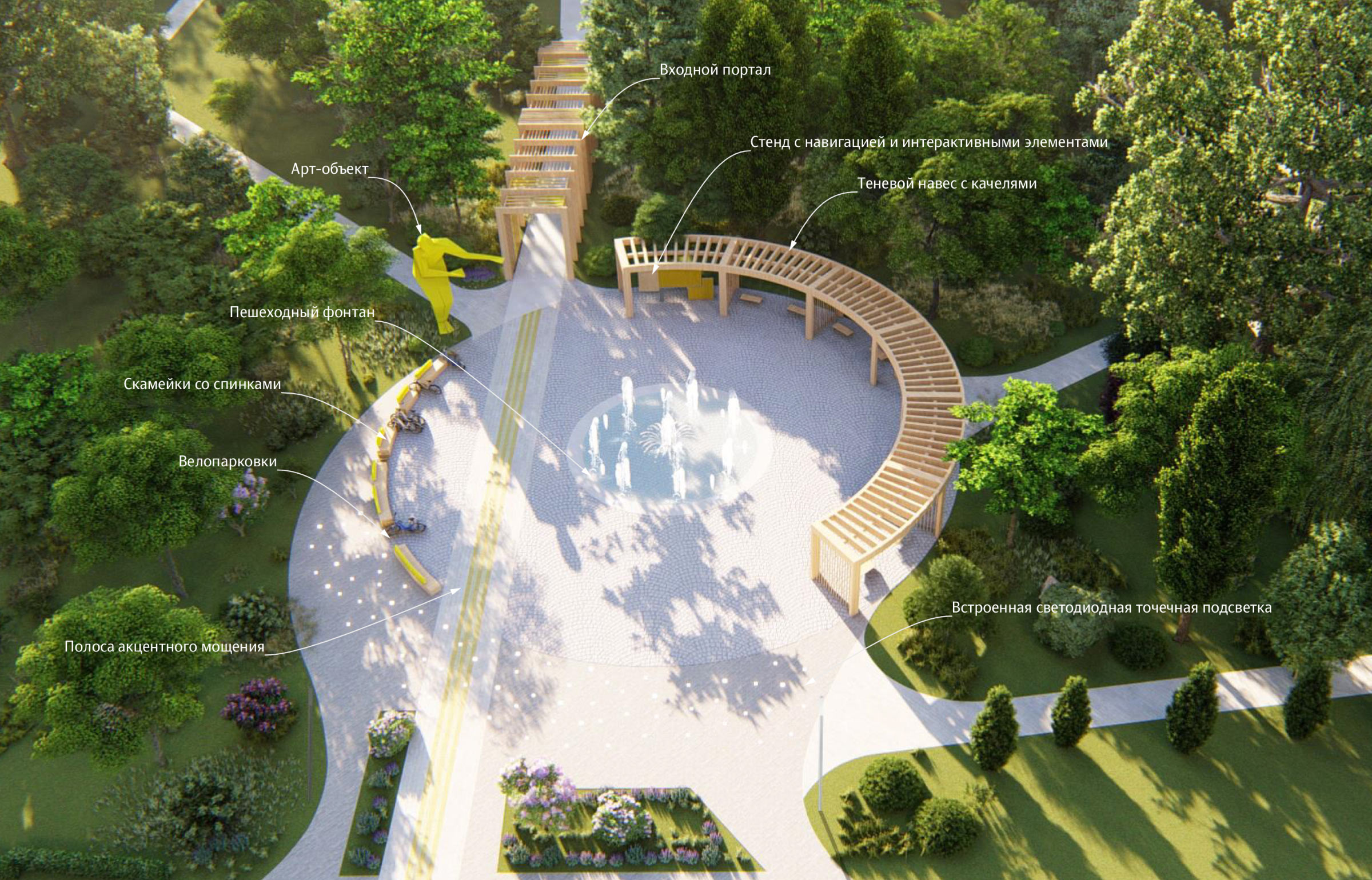 The main entrance to the park became an important public space, a place to rest, meet, communicate and spend time together. The square has a semicircular shady canopy with swings, and a pedestrian fountain.