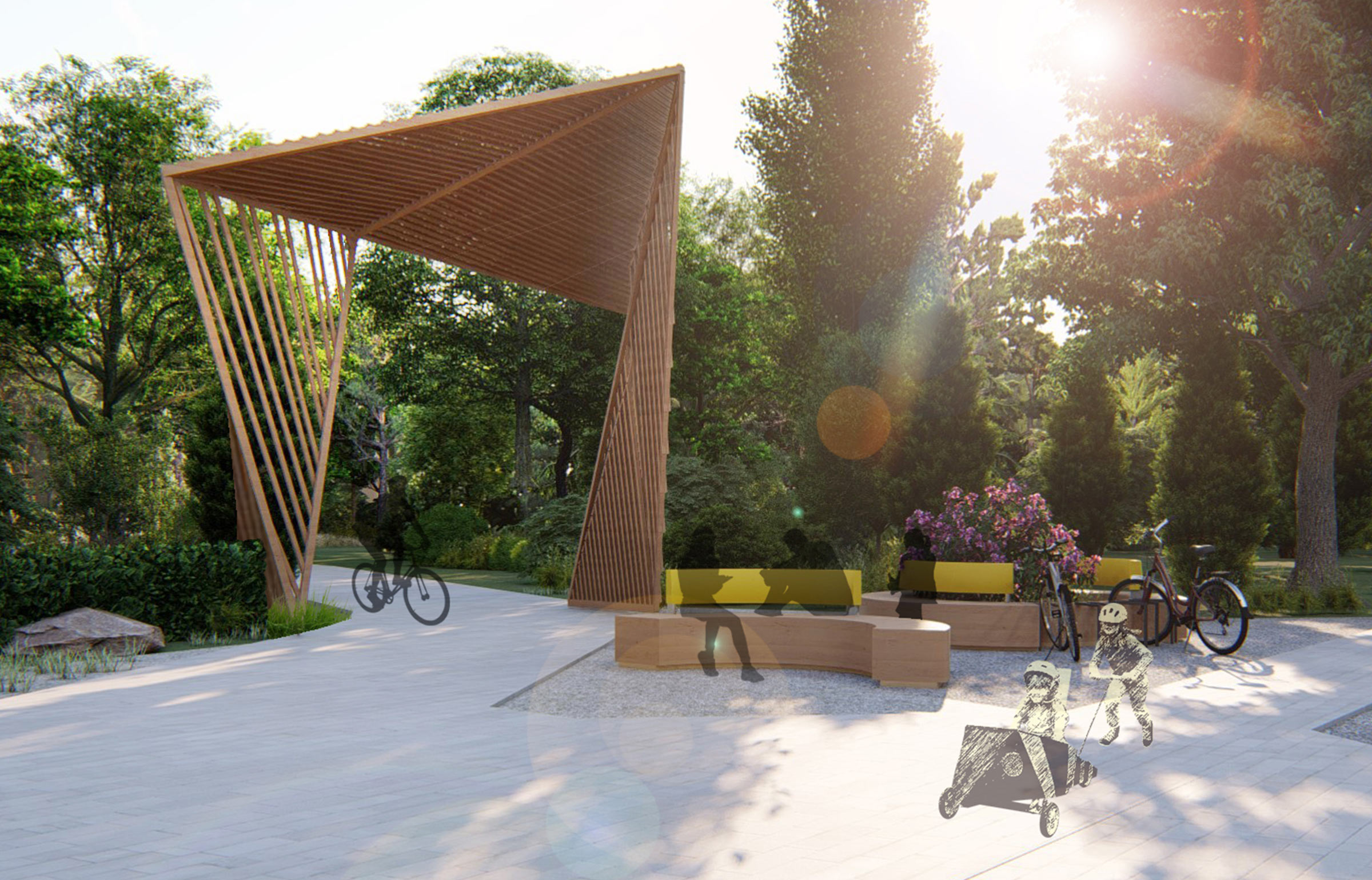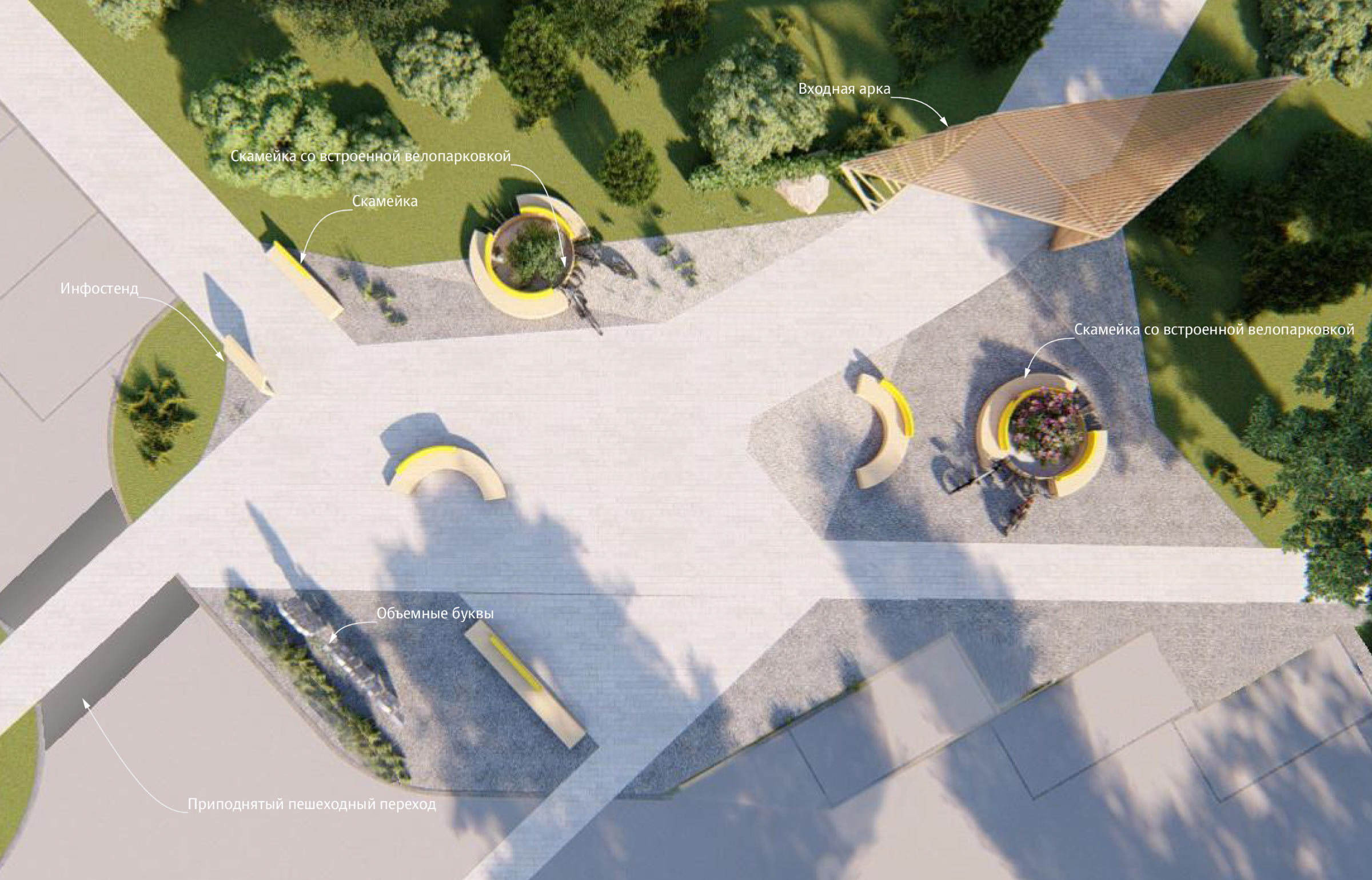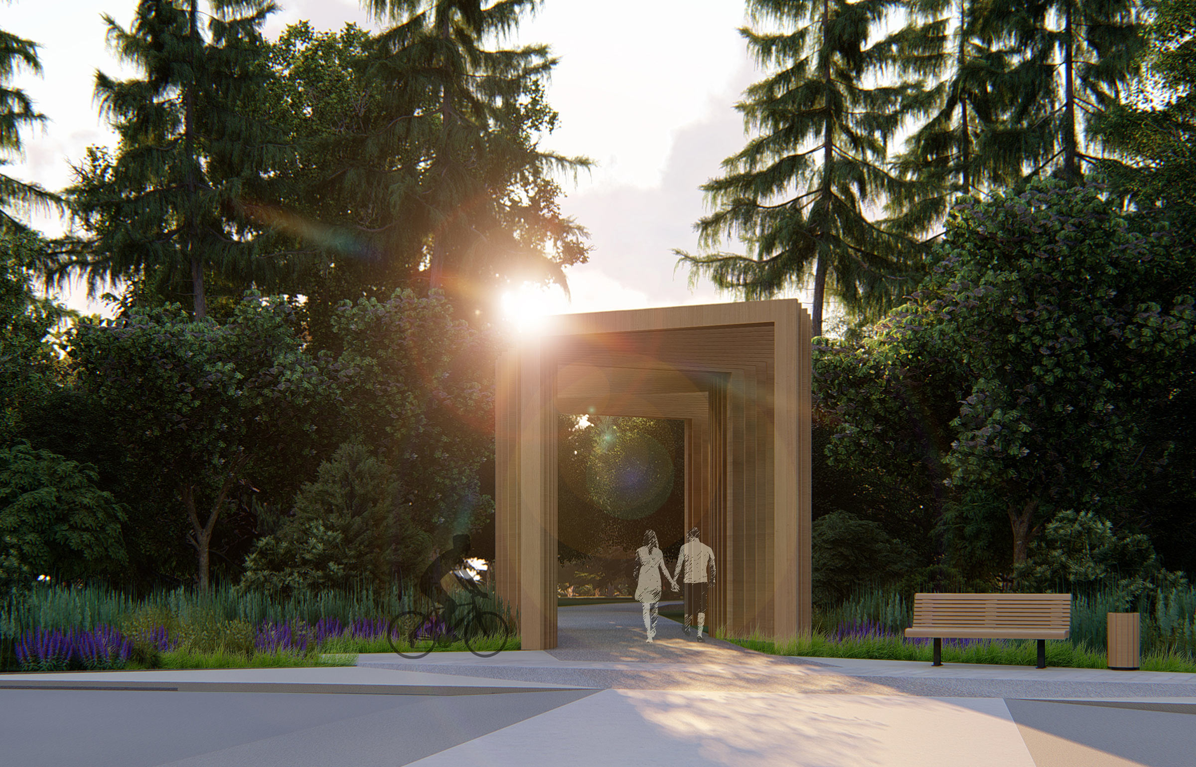 The main entrance to the park became an important public space, a place to rest, meet, communicate and spend time together. The square has a semicircular shady canopy with swings, and a pedestrian fountain.