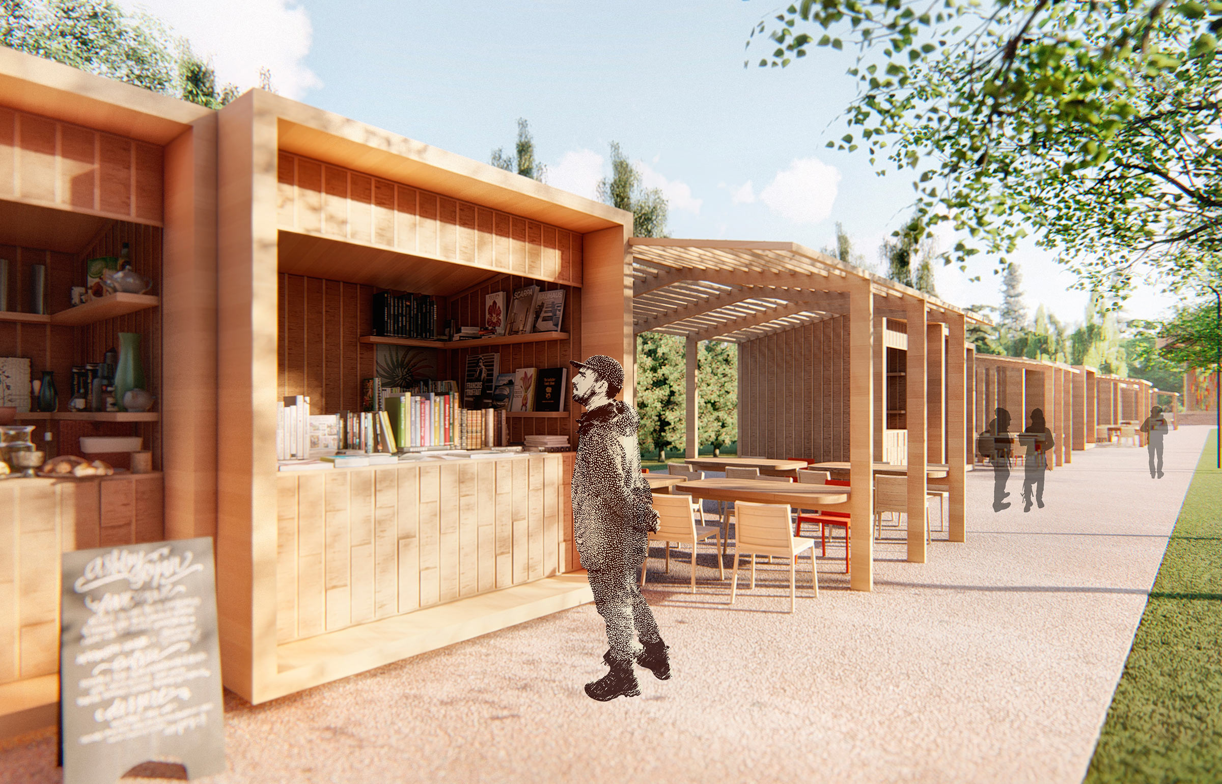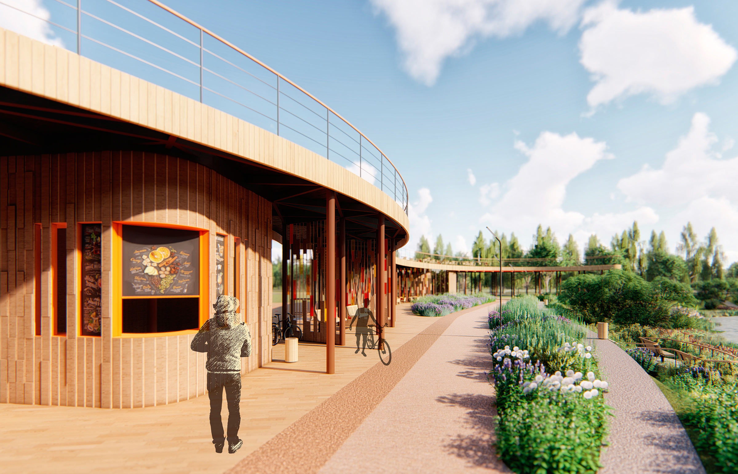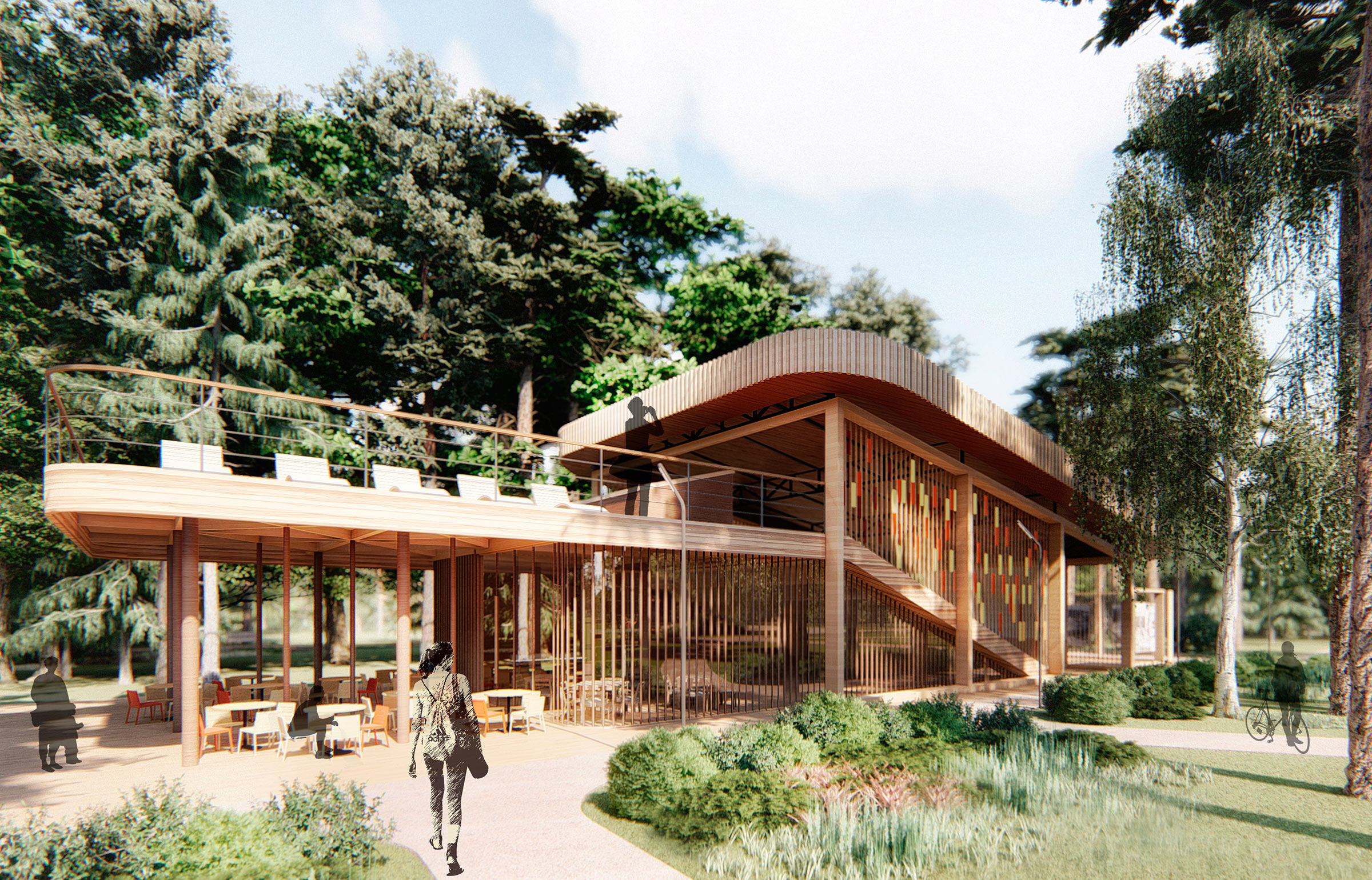 The enlightenment and recreation area contains a multifunctional facility with a summer café, a lecture hall, an amphitheater and a space for street photo exhibitions. It is used for workshops, movie screenings, lectures and performances.