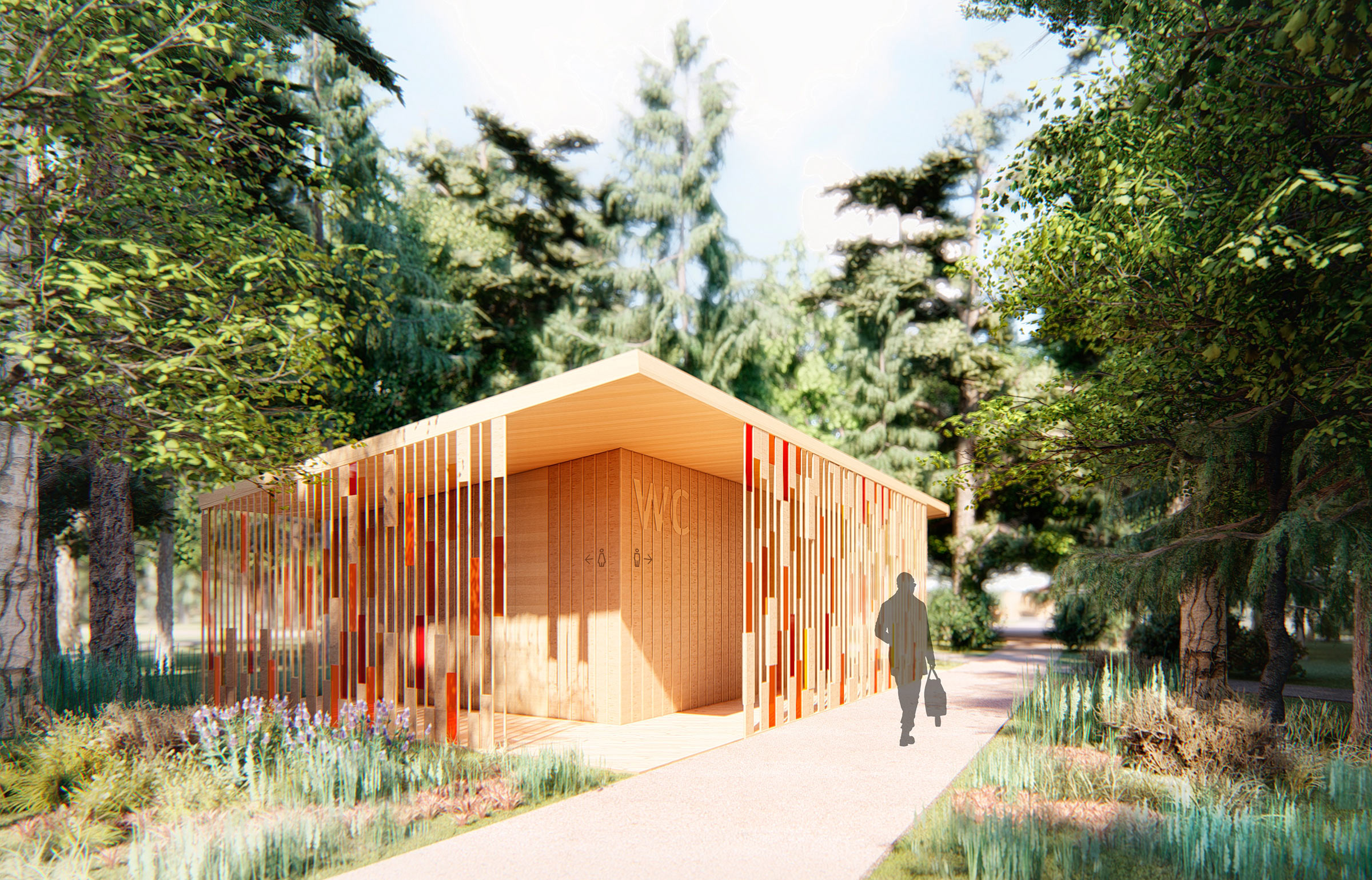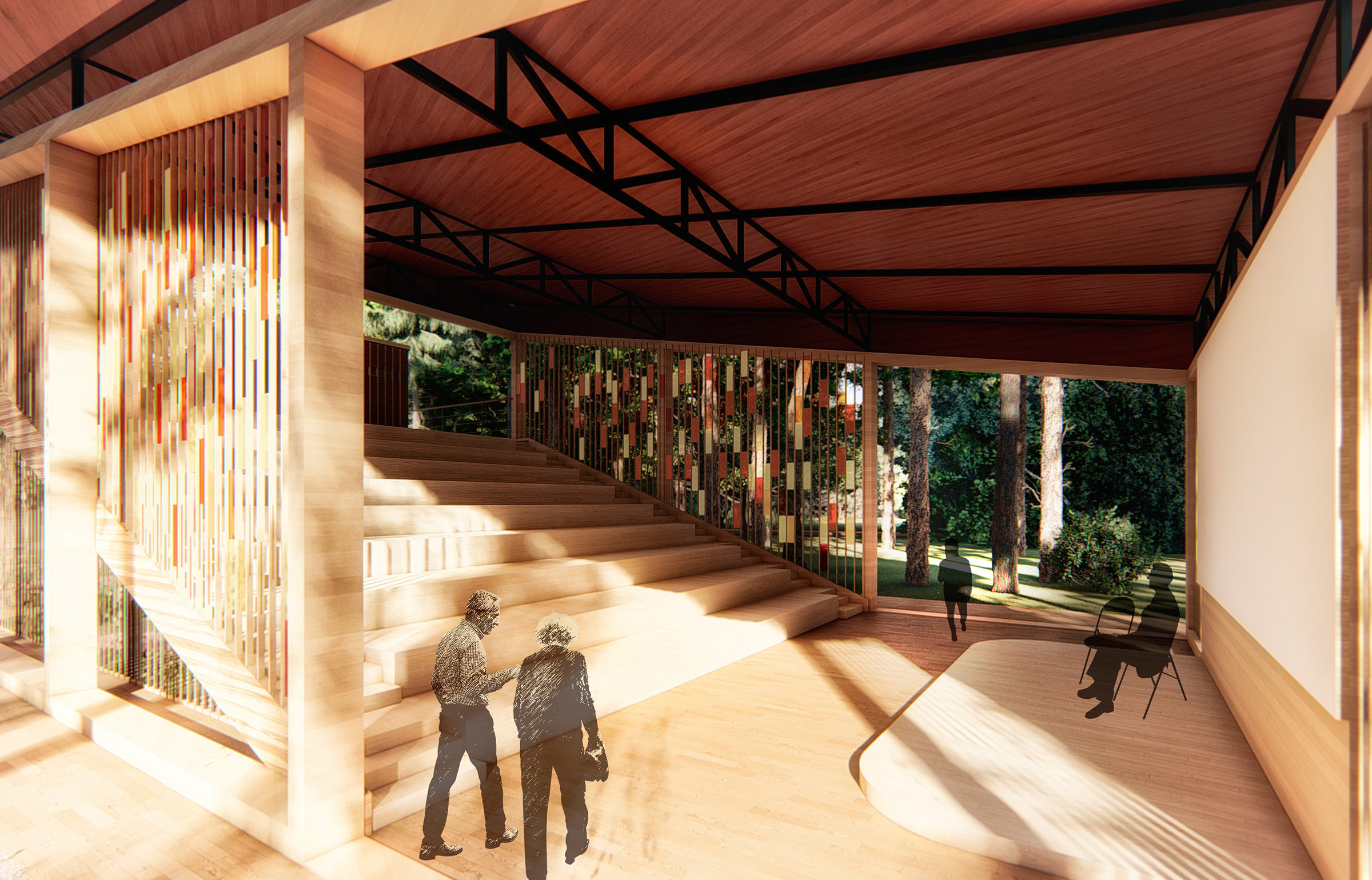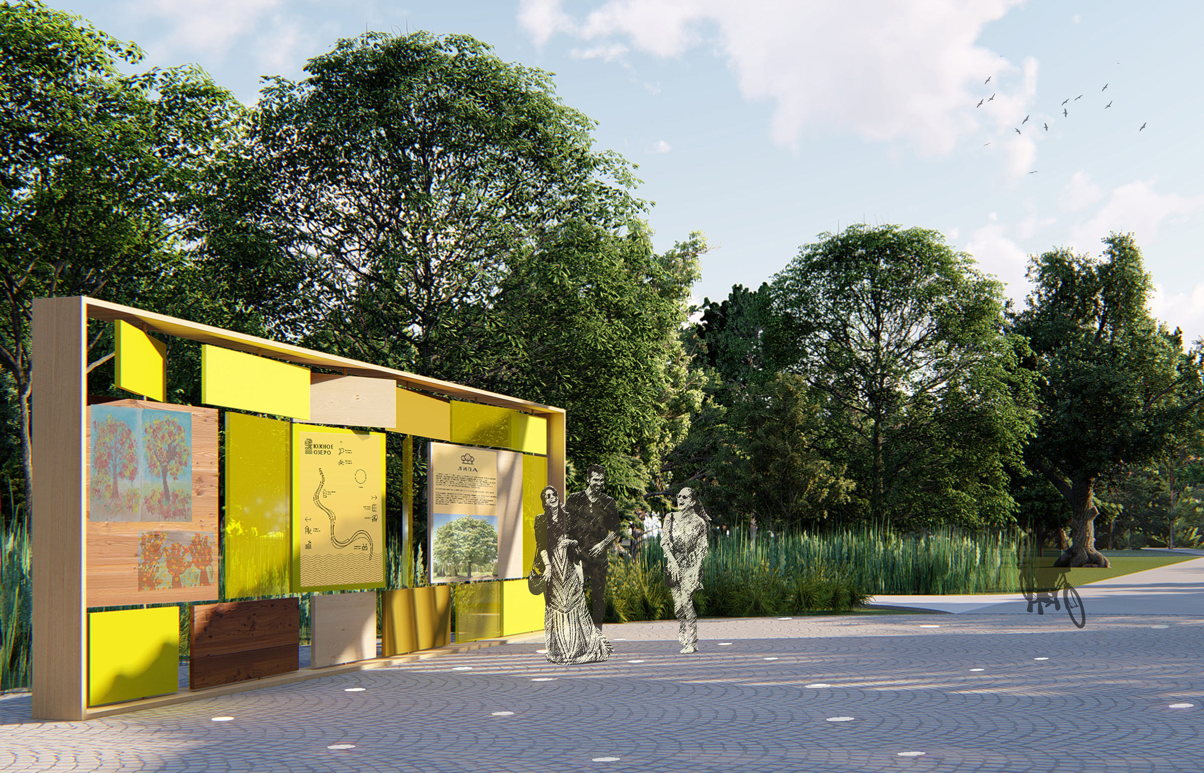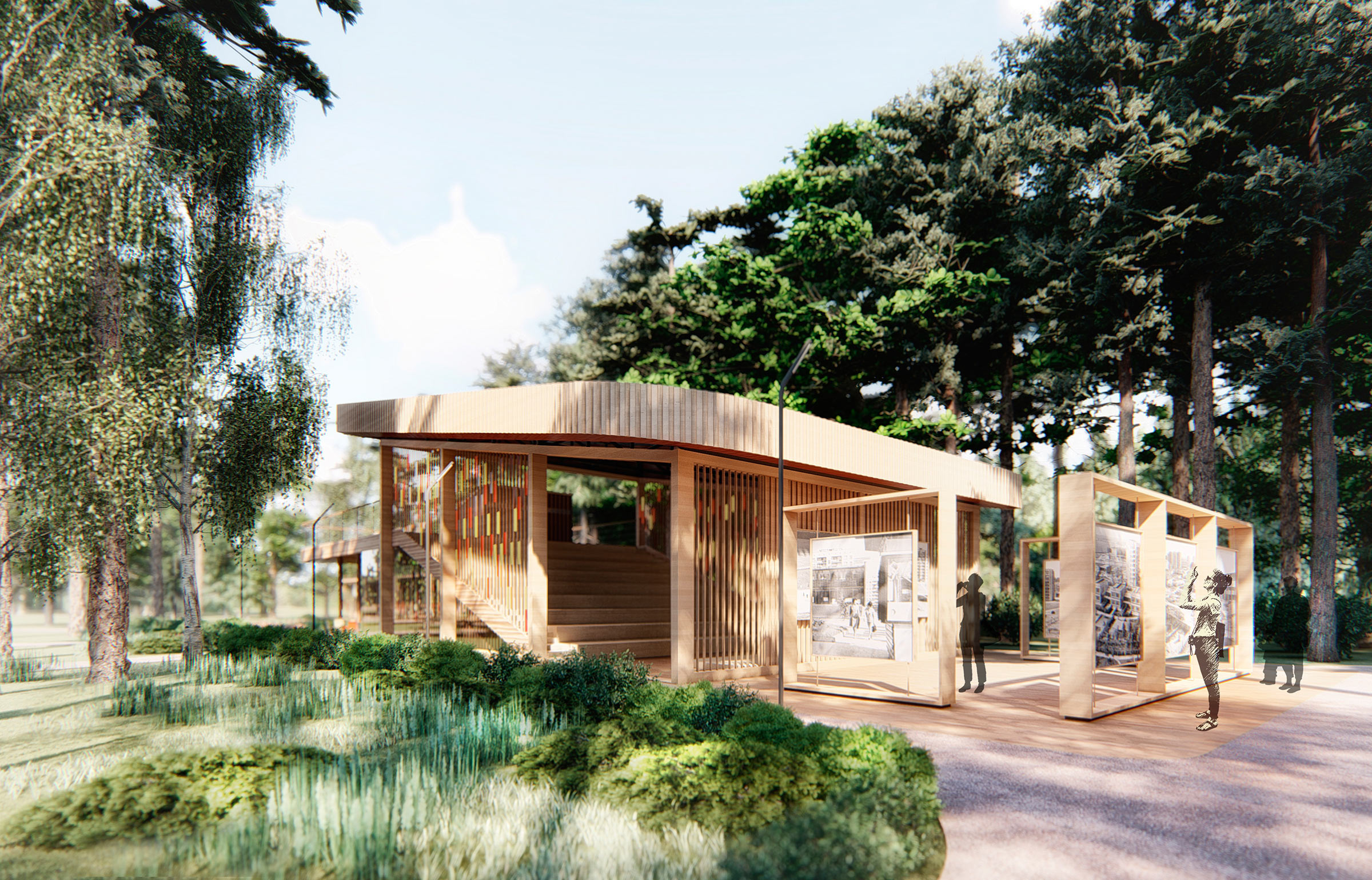 Nearby is an exhibition stand with rotating panels of different colors and textures. All elements are made of wood and smoothly blend in with natural surroundings.