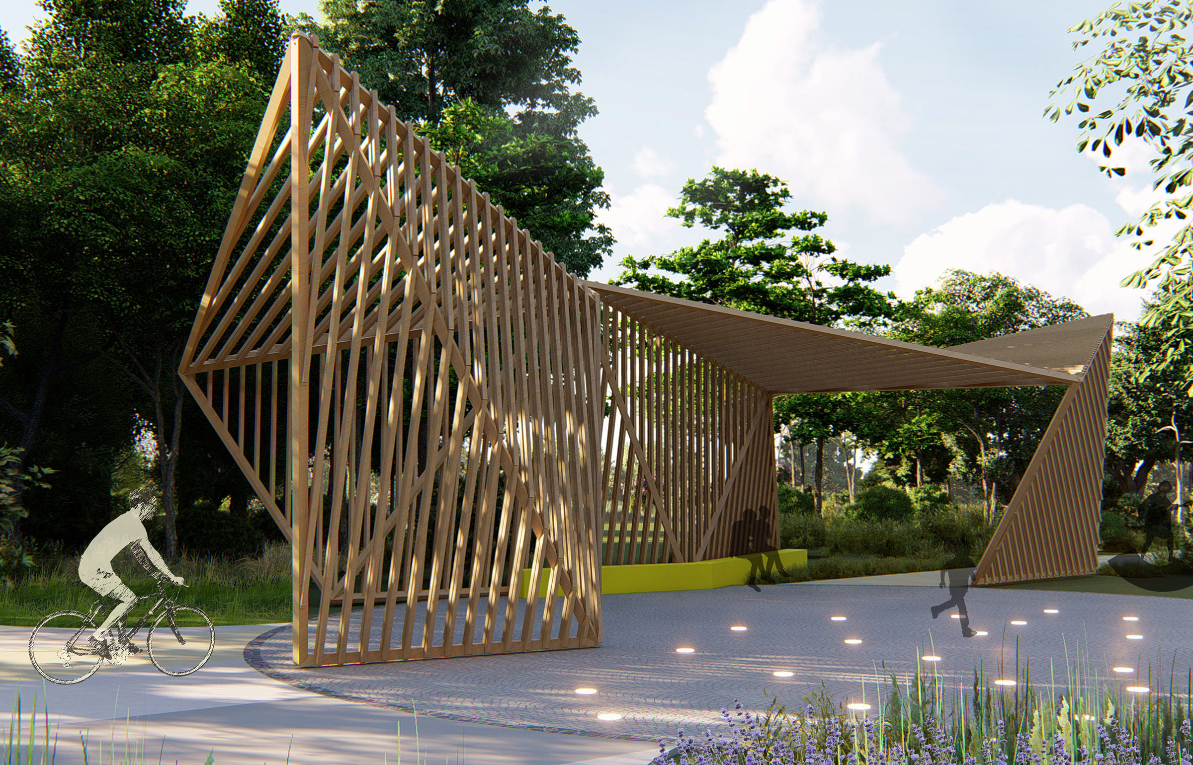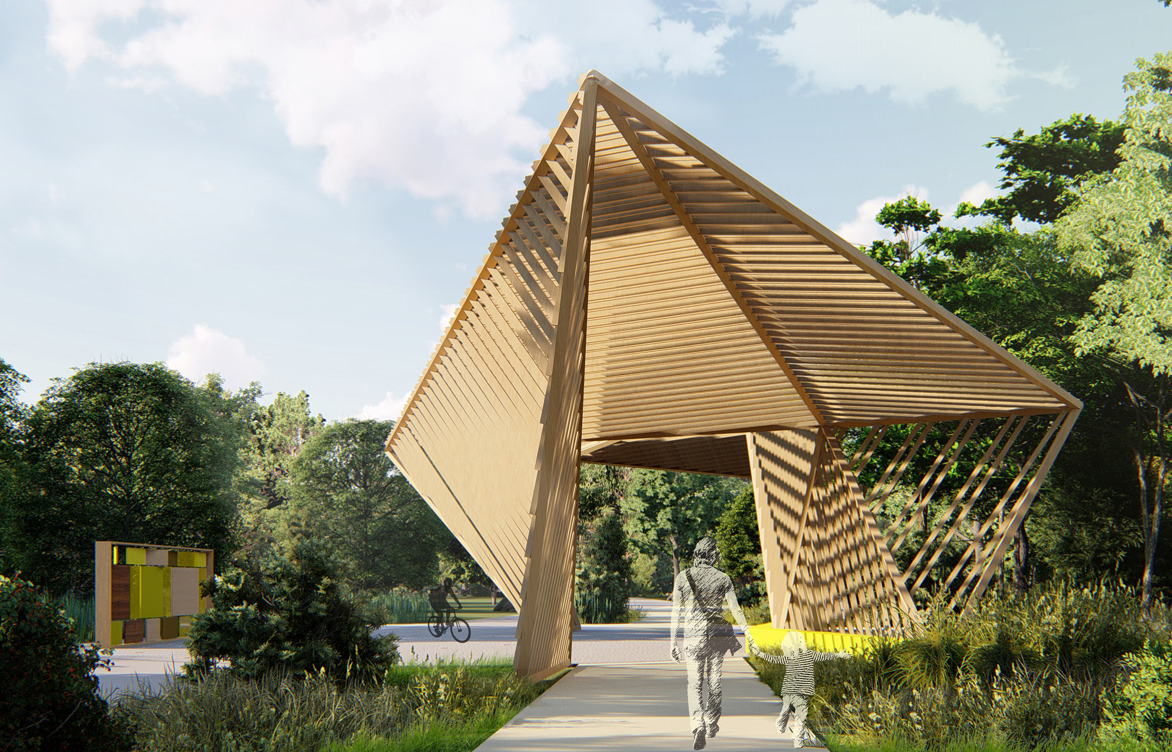 Visitors are greeted by a tall dynamic portal that beautifully stands out against the surrounding thick forest. Next to it are large letters that work as a geotag, a photo spot and advertising for the park.