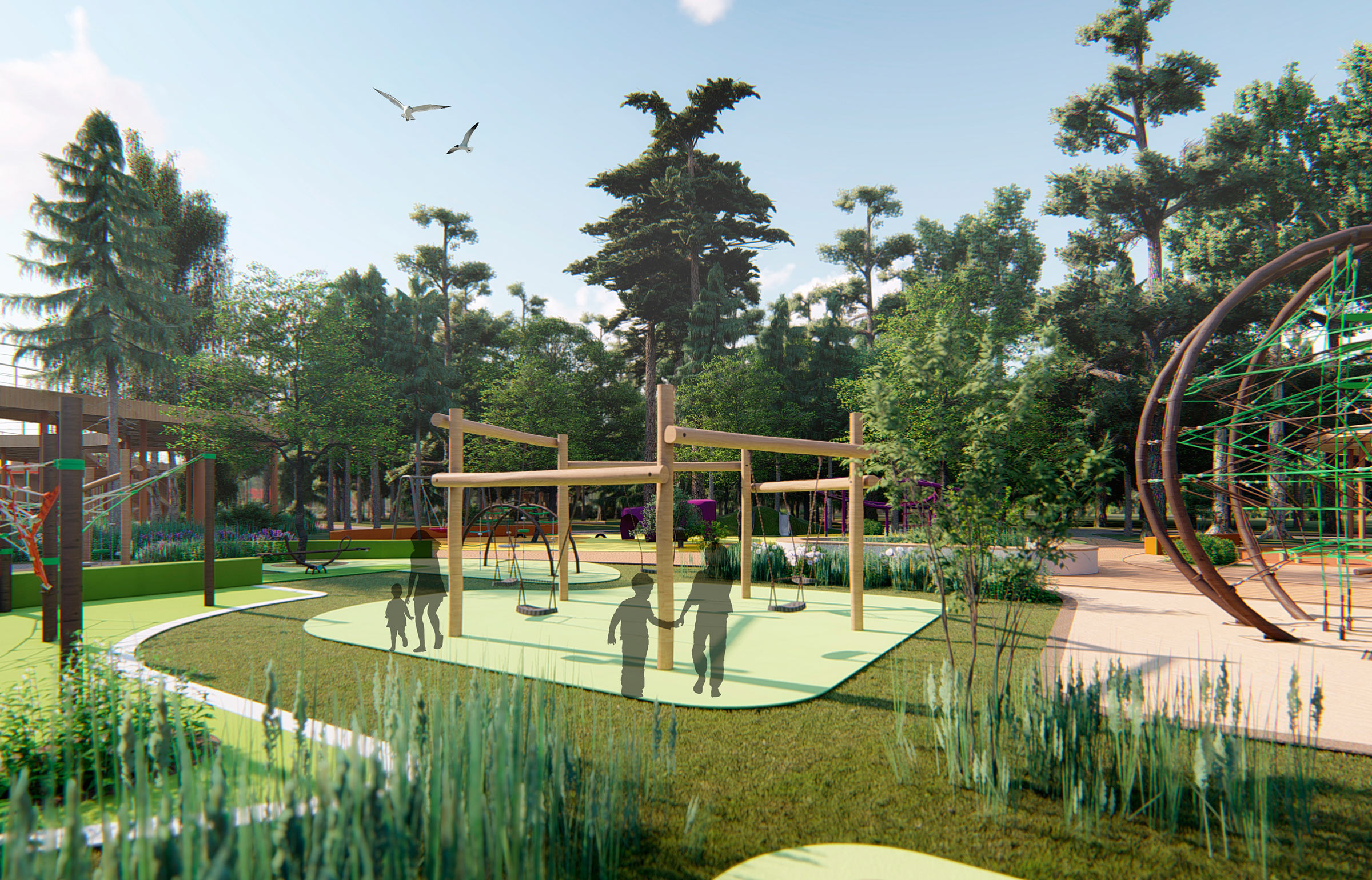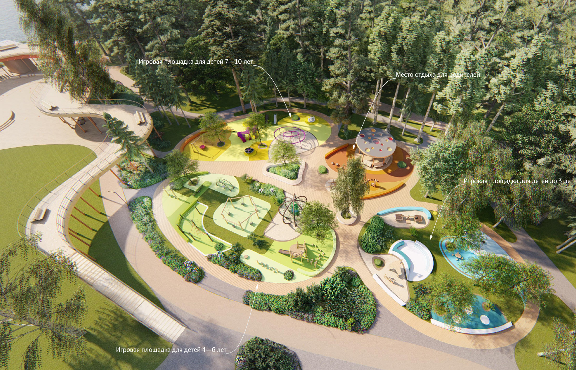 The playground is divided into four parts: for toddlers, for kids aged 4-6, 7-10 and for adults. Zones for kids take into account the needs of children at each age. The adult zone has benches and a parking area for strollers and scooters.